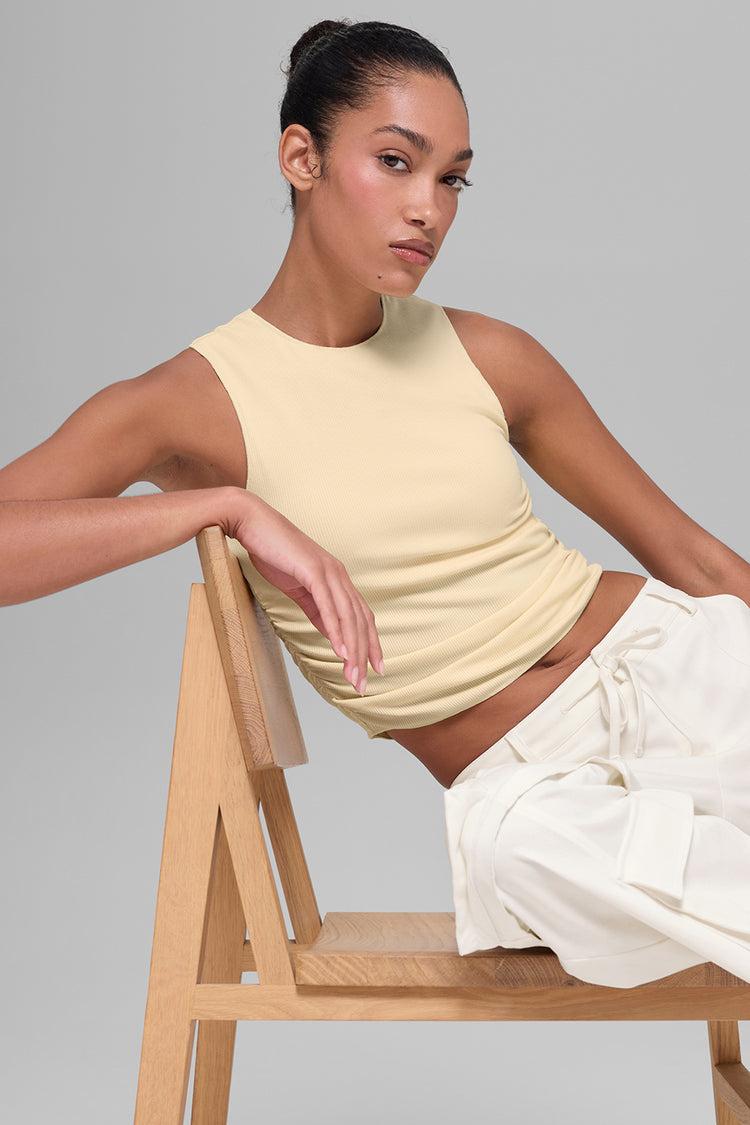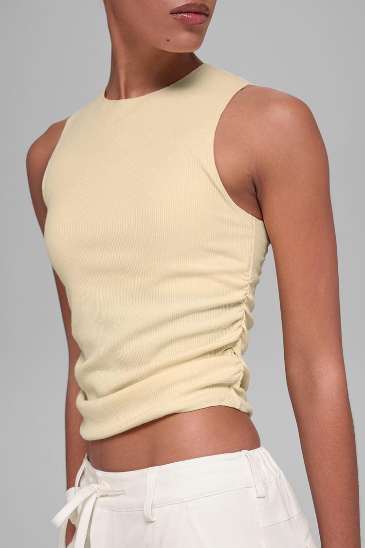 This tank is so en pointe. The ribbed fabric adds a subtle touch of texture, and the side cinching lets you customize the crop of the hemline. With a comfy, built-in shelf bra and a double-layered front, you can style it with everything from leggings to trousers.