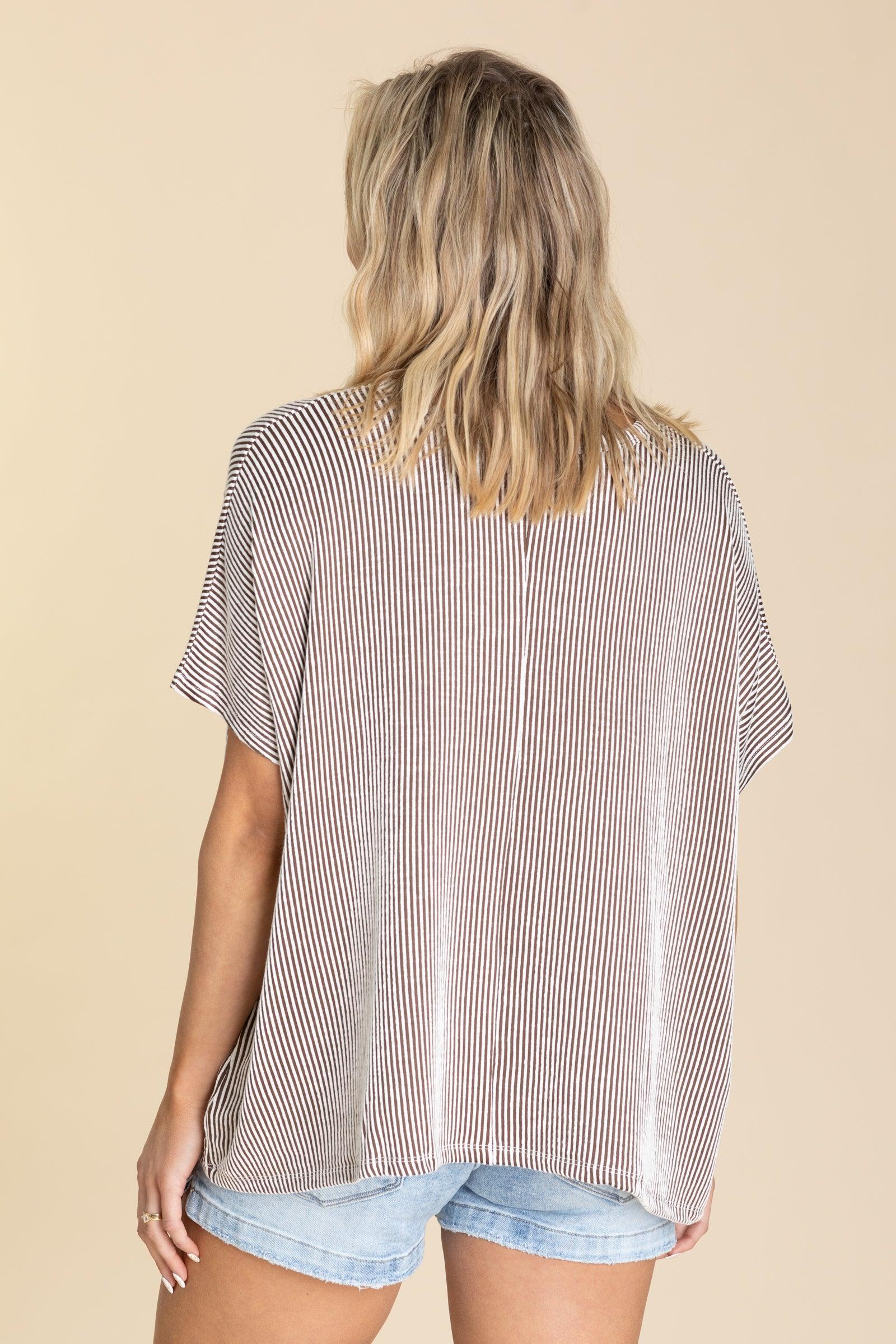 Product Details Colors: Ash Mocha, White/ Brown, White/ Ocean Blue, White/ Ruby, White/ Violet Print: Stripes Neckline: Round Sleeve: Short Sleeve Hemline: Straight Brand: Zenana Material and Care 57% Rayon 40% Polyester 3% Spandex Machine Wash Cold Hang/Line Dry Size and Fit Small/Medium: Bust 58" Waist 58" Length 23" Large/X Large: Bust 60" Waist 60" Length 24" 1X Large/ 2X Large: Bust 64" Waist 64" Length 25" 2X Large/ 3X Large: Bust 66" Waist 66" Length 26" Erica is 5’7” and wearing her true size small Sarah is 5’8” and wearing her true size small
