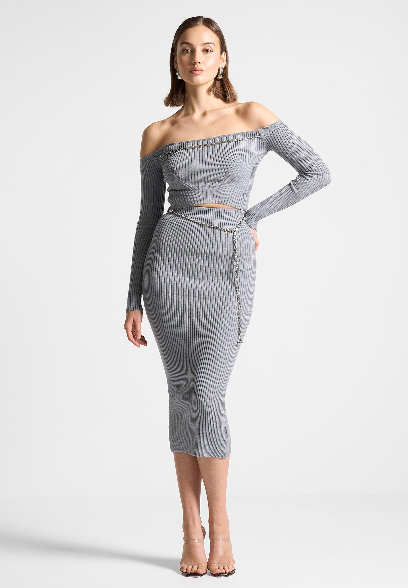 This premium black ribbed crop top features a bardot neckline and a cropped design for a chic and modern look. The knit fabric offers a soft textured style and the chain detail elevates any outfit. Crop Top Silhouette Off Shoulder Design Chain Feature Long Sleeve Premium Stretch Knit Fabric Silver Manière De Voir Eiffel Plaque 50% Viscose, 30% Polyester, 20% NylonAlways check the care label for wash instructions.