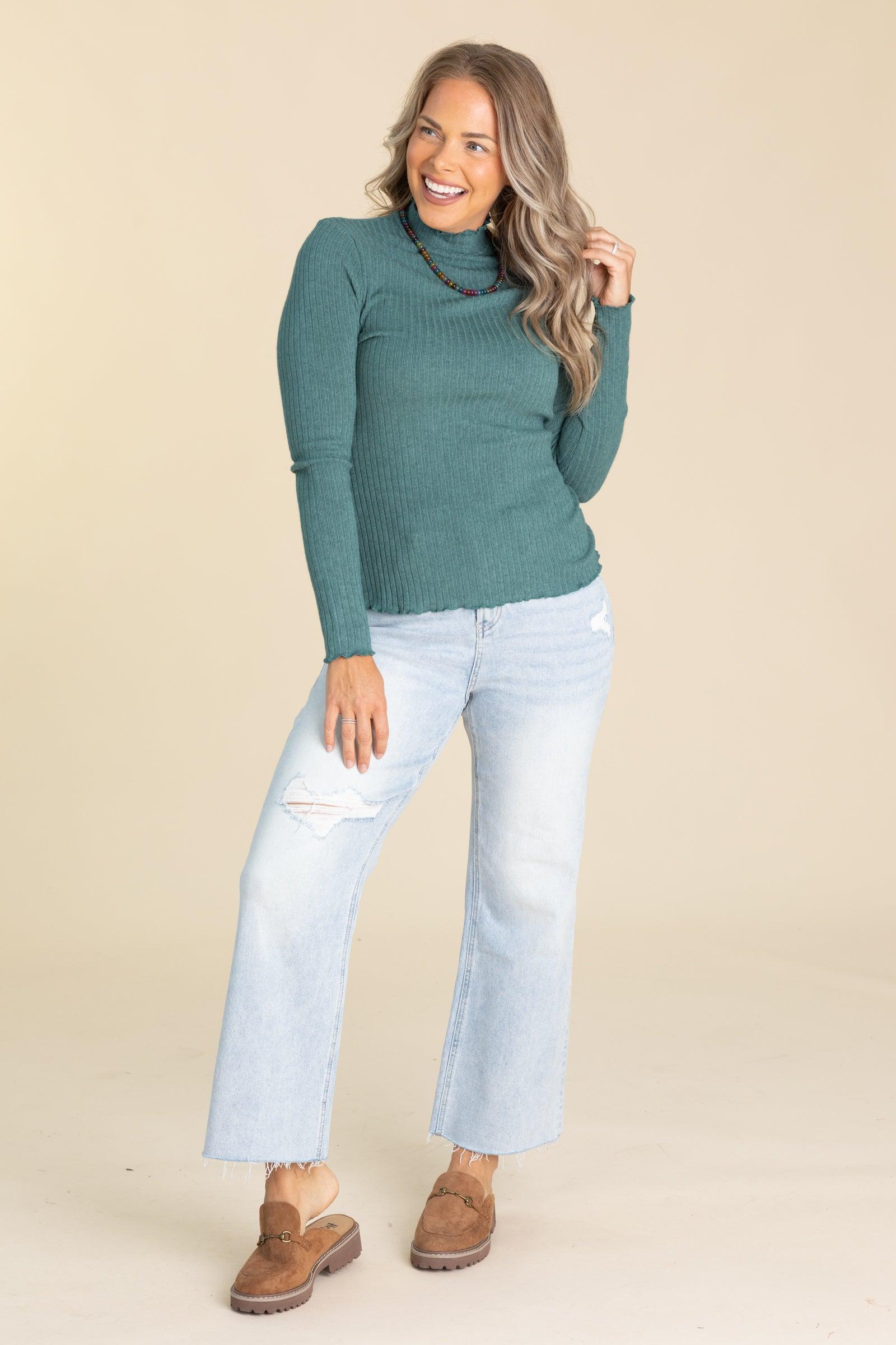 Product Details Colors: Black/ Brown/ Burgundy/ Dark Jade/ Heather Grey/ Ivory/ Navy Print: Textured Solid Neckline: Mock Neck with Lettuce Edge Sleeve: Long Sleeve Hemline: Straight (Lettuce Edge) Brand: Staccato Material and Care 48% Rayon 24% Polyester 24% Nylon 4% Spandex Hand Wash Cold Hang/Line Dry Size and Fit Small: Bust 32" Waist 28" Length 25" Medium: Bust 34" Waist 30" Length 25.5" Large: Bust 36" Waist 32" Length 26" X Large: Bust 38" Waist 34" Length 26.5" Erica is 5’7” and wearing her true size small