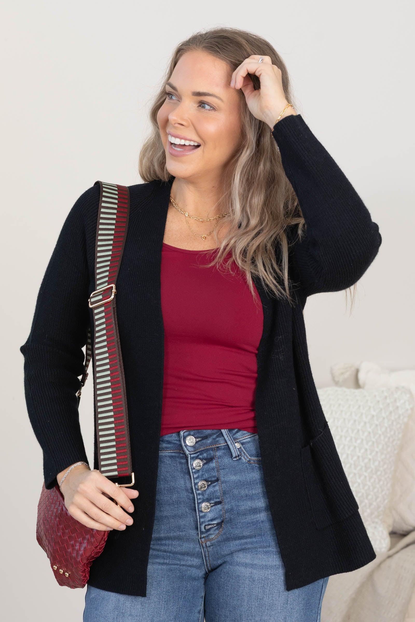 Product Details Colors: Black, Teal Print: Solid Neckline: Open Front Sleeve: Long Sleeve Hemline: Straight Brand: Staccato Material and Care 55% Viscose 45% Nylon Hand Wash Cold Hang/ Line Dry Size and Fit Small: Bust 38" Waist 38" Length 26" Medium: Bust 40" Waist 40" Length 26.5" Large: Bust 42" Waist "42 Length 27" X Large: Bust 44" Waist 44" Length 27.5" Erica is 5’7” and wearing her true size small
