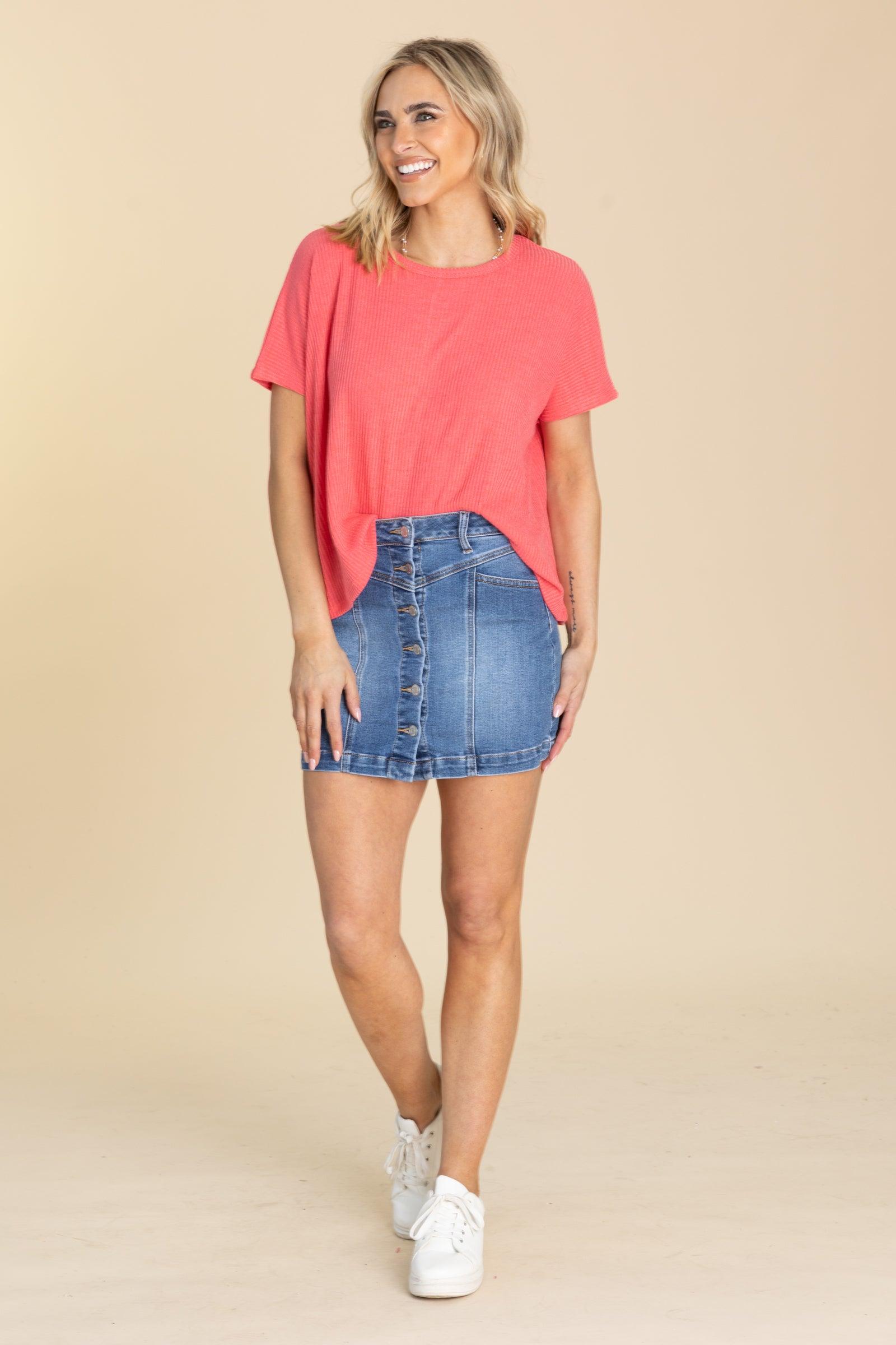 Product Details Colors: Black/Off White/Sky Blue/Coral Print: Solid Neckline: Round Sleeves: Short Sleeves Hemline: Straight Brand: Zenana Material and Care 83% Polyester 14% Rayon 3% Spandex Machine Wash Cold Hang Dry Size and Fit Small/Medium: Bust 54" Waist 52" Length 21.5" Large/X Large: Bust 58" Waist 56" Length 22.5" Sarah is 5’8” and wearing her true size small