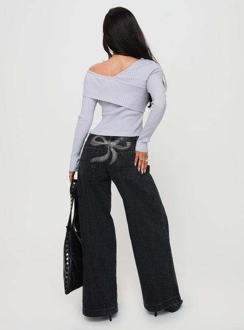 Ribbon Stamp Wide Leg Jeans Washed Black