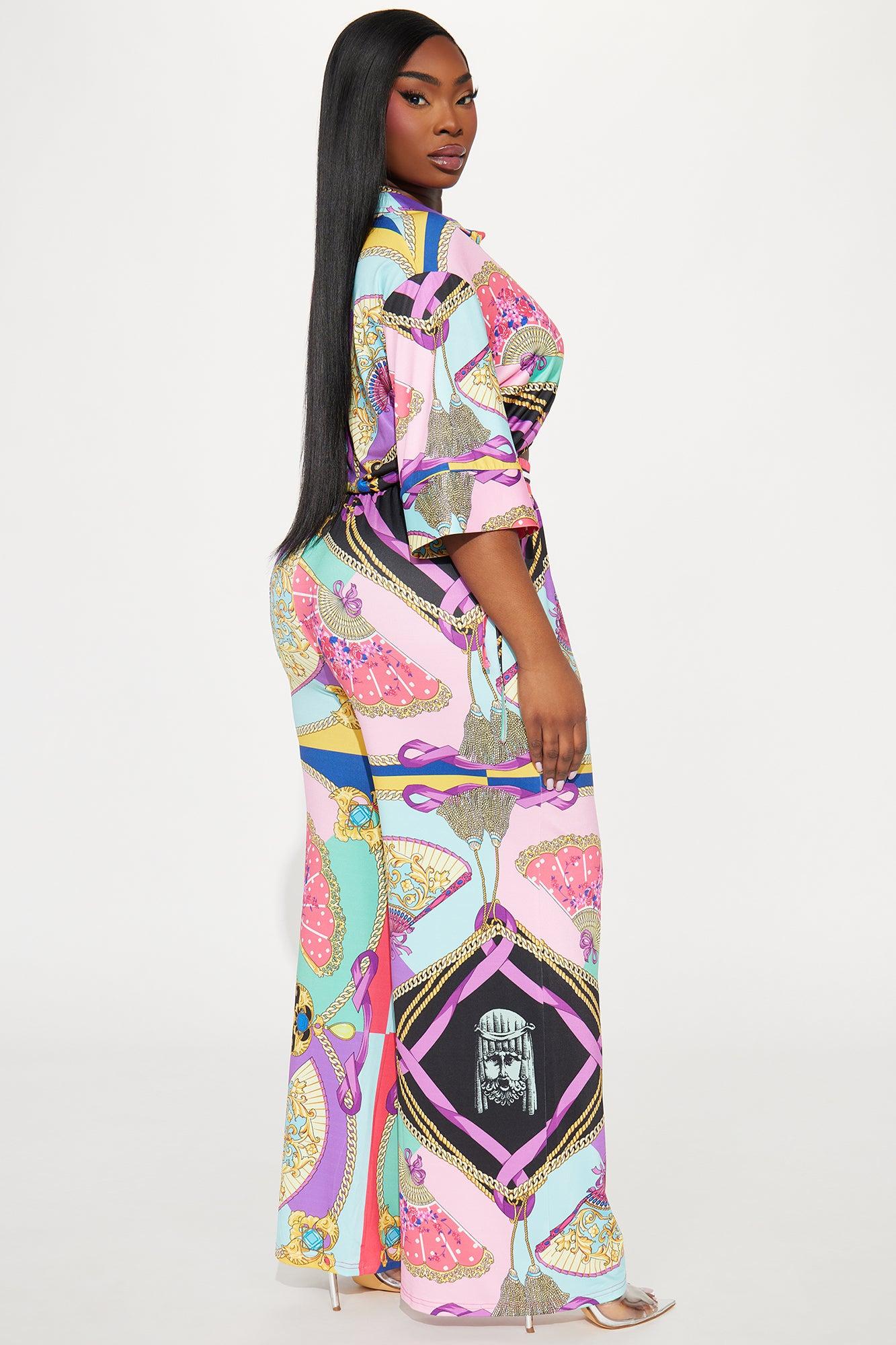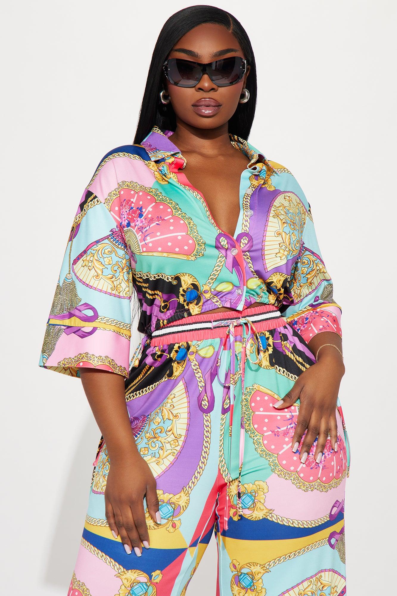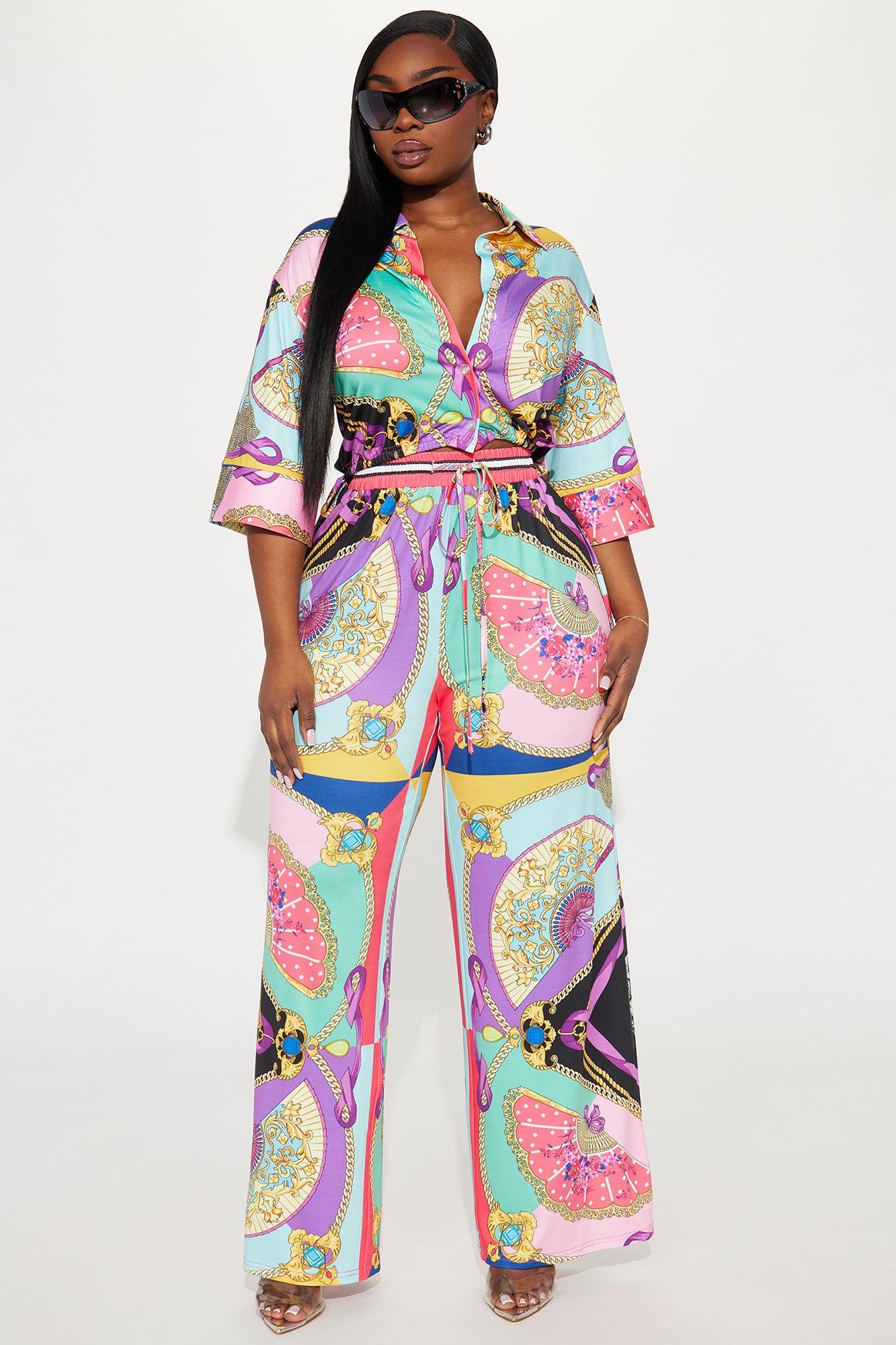 Available In Orange/combo And Purple/combo. Pant Set Collar Short Sleeve Button Front Cropped Wide Leg Elastic Waistband Adjustable Side Drawstrings Stretch Inseam: 32" Disclaimer: Print Placement Will Vary Shell: 95% Polyester 5% Spandex Imported
