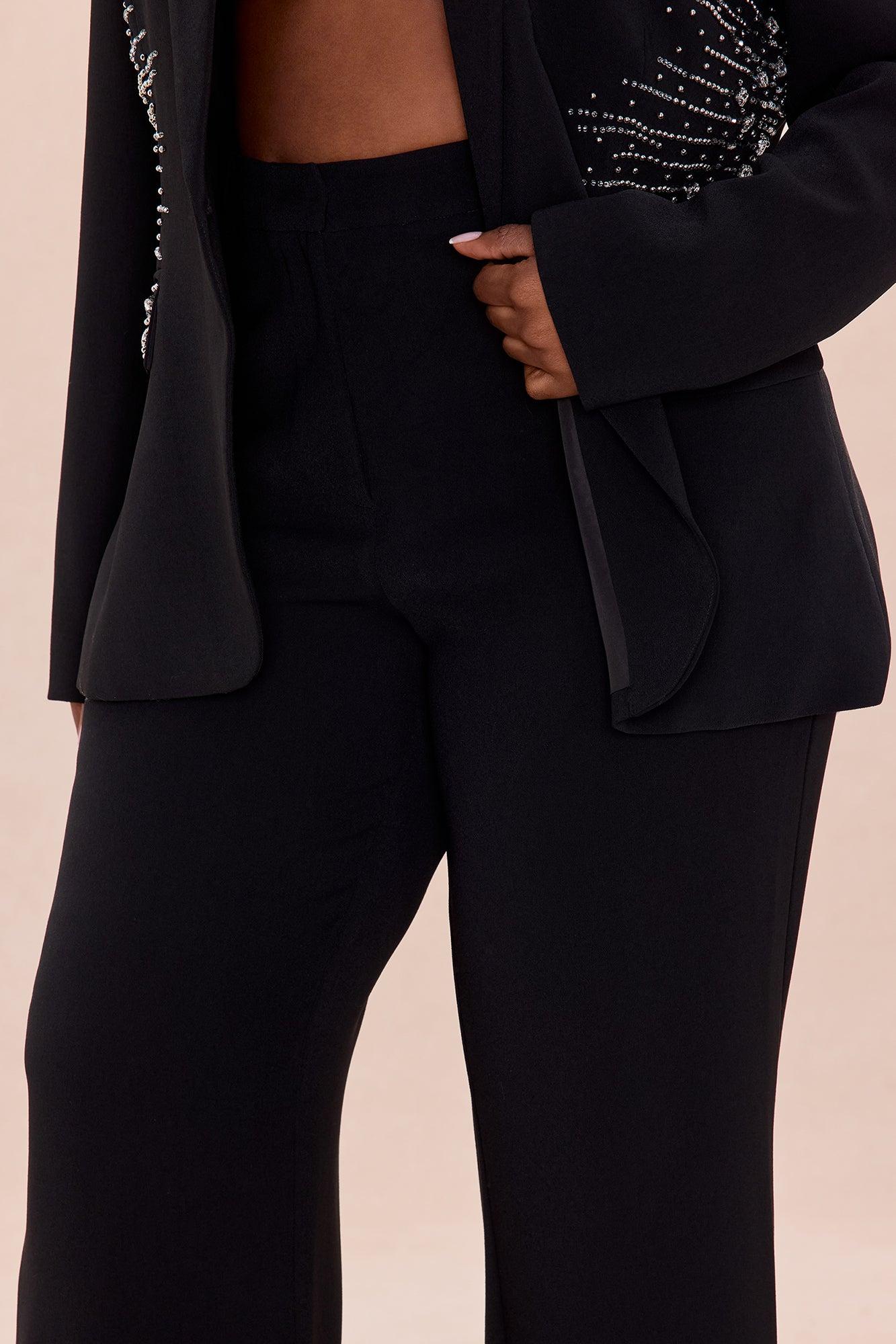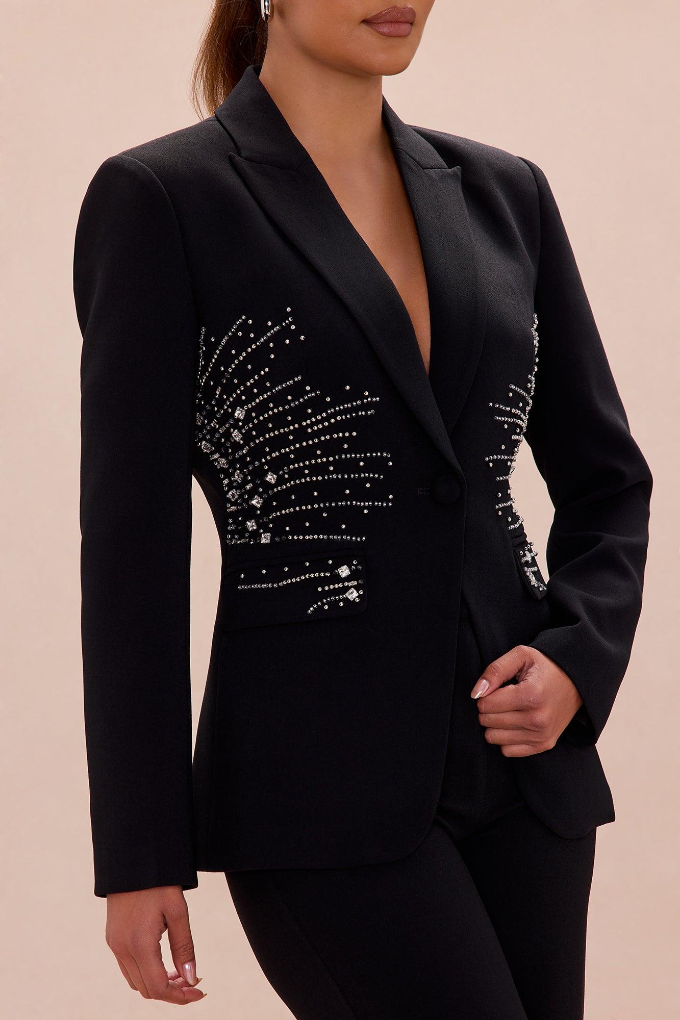 Available In Black And Royal. Blazer Pant Ensemble Collared Long Sleeve Blazer With Shoulder Pads Embellished Faux Pockets Front Button Closure Lined Non Stretch Wide Leg Pant Belt Loops Pockets Front Hook And Zipper Closure Self/Lining: 100% Polyester Imported
