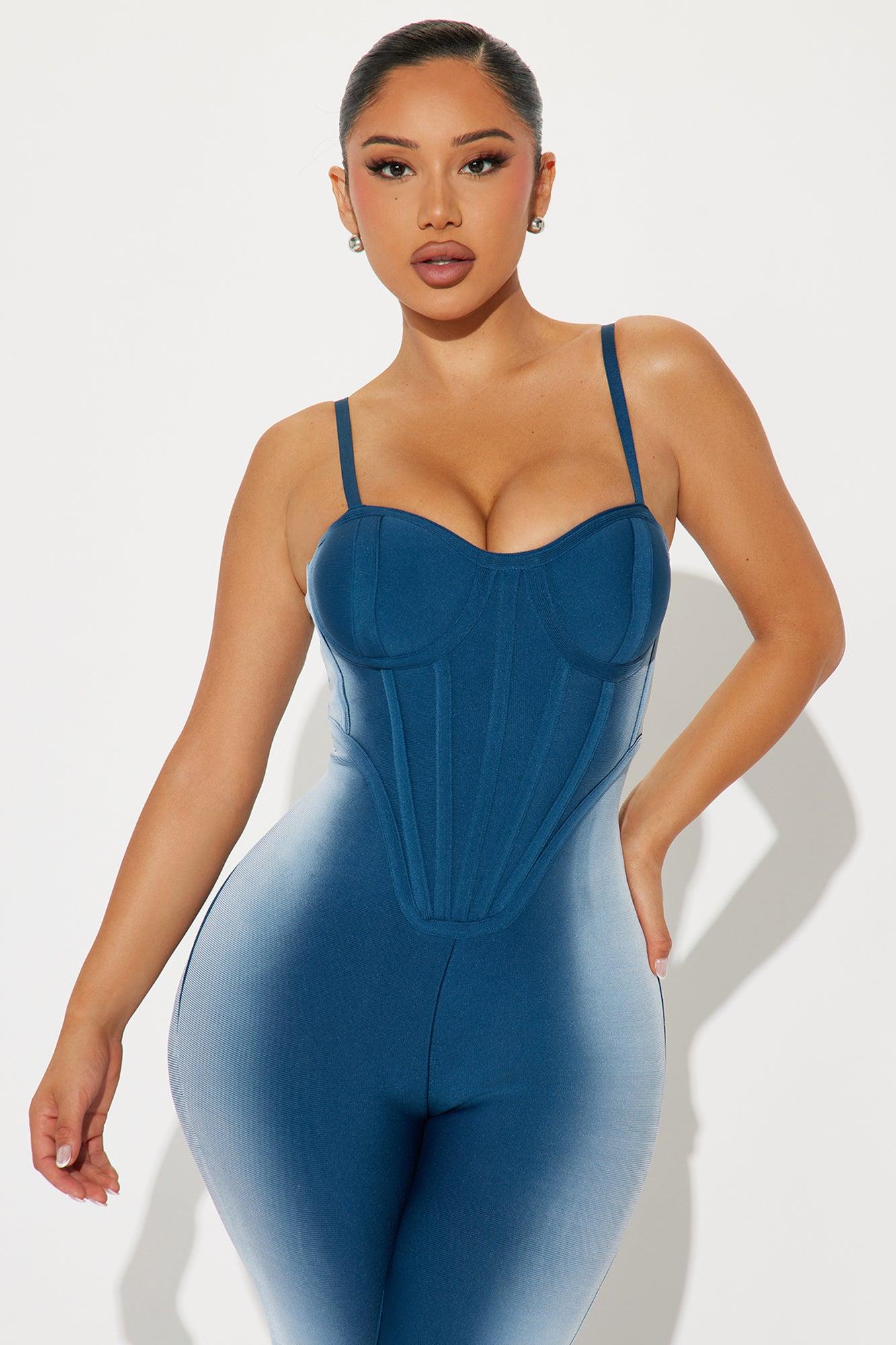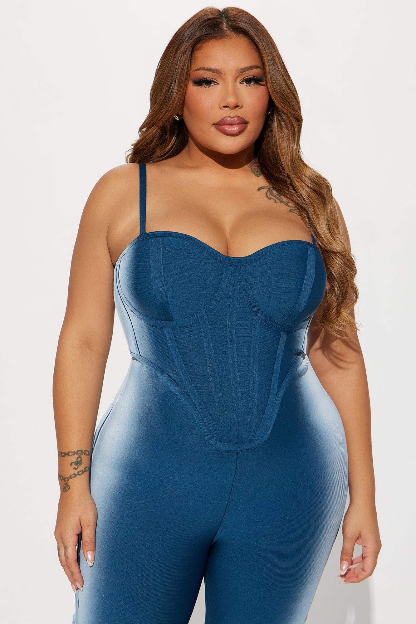 Available In Purple/combo And Blue/combo. Bandage Jumpsuit Adjustable Spaghetti Straps Sweetheart Neckline Corset Detail Padded Cups Hidden Back Zipper Legging Stretch Self: 90% Polyester 10% Spandex Lining: 95% Polyester 5% Spandex Imported California Proposition 65 WARNING: Cancer and Reproductive Harm - www.P65Warnings.ca.gov.