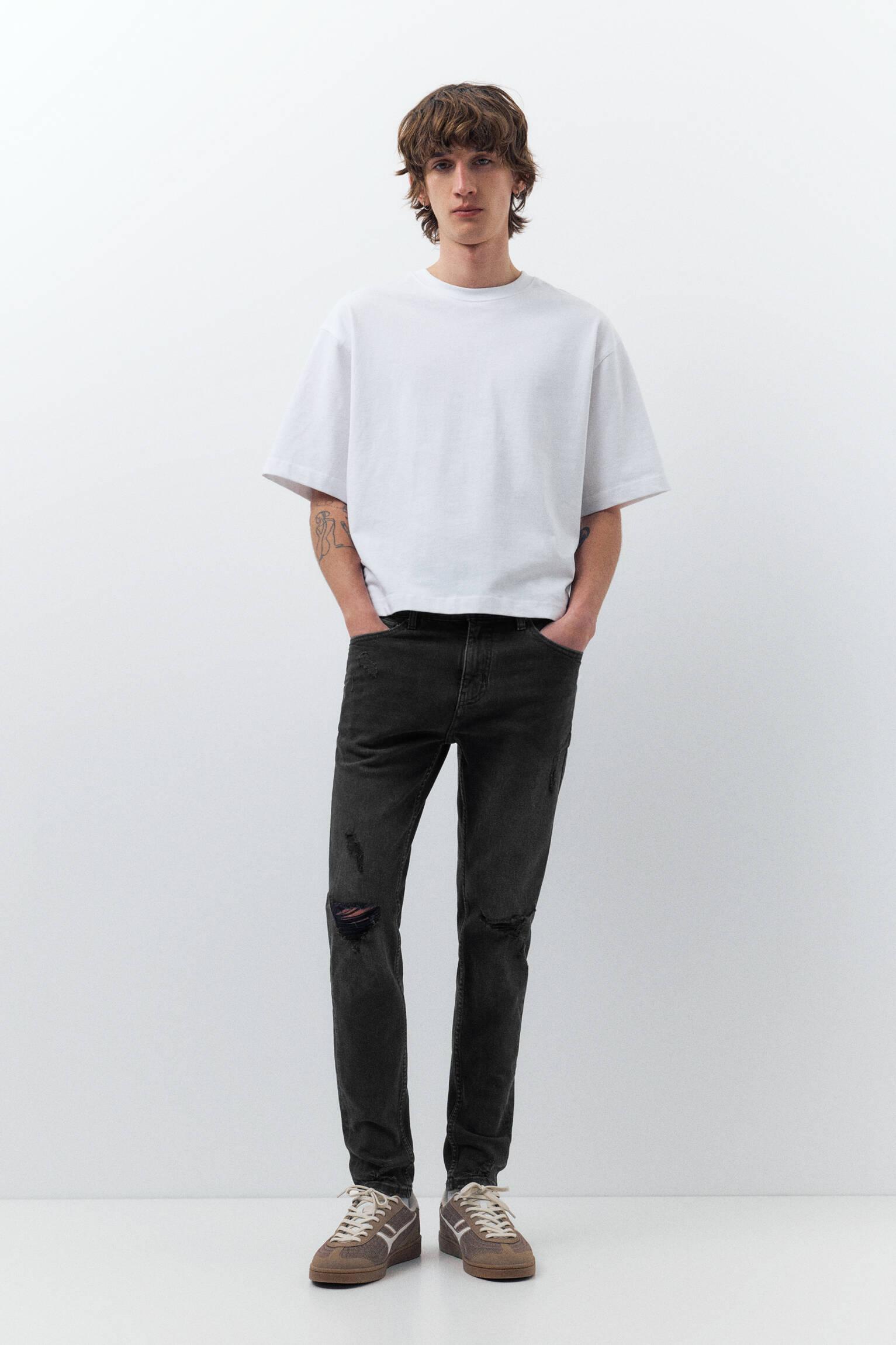 Skinny jeans with ripped detailing on the legs, a five-pocket design, belt loops, and zipper fly and top button fastening. Made of slightly stretchy fabric.