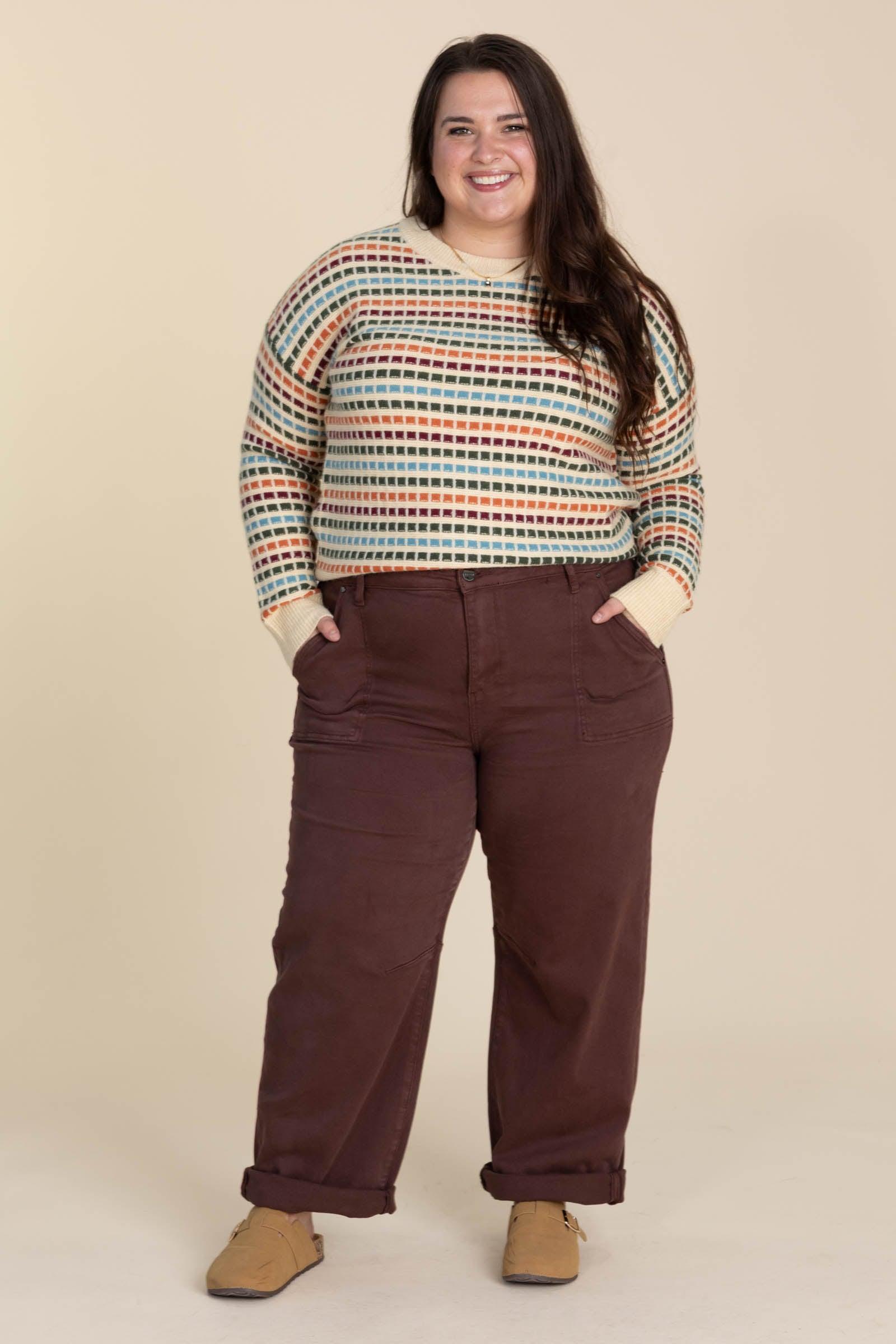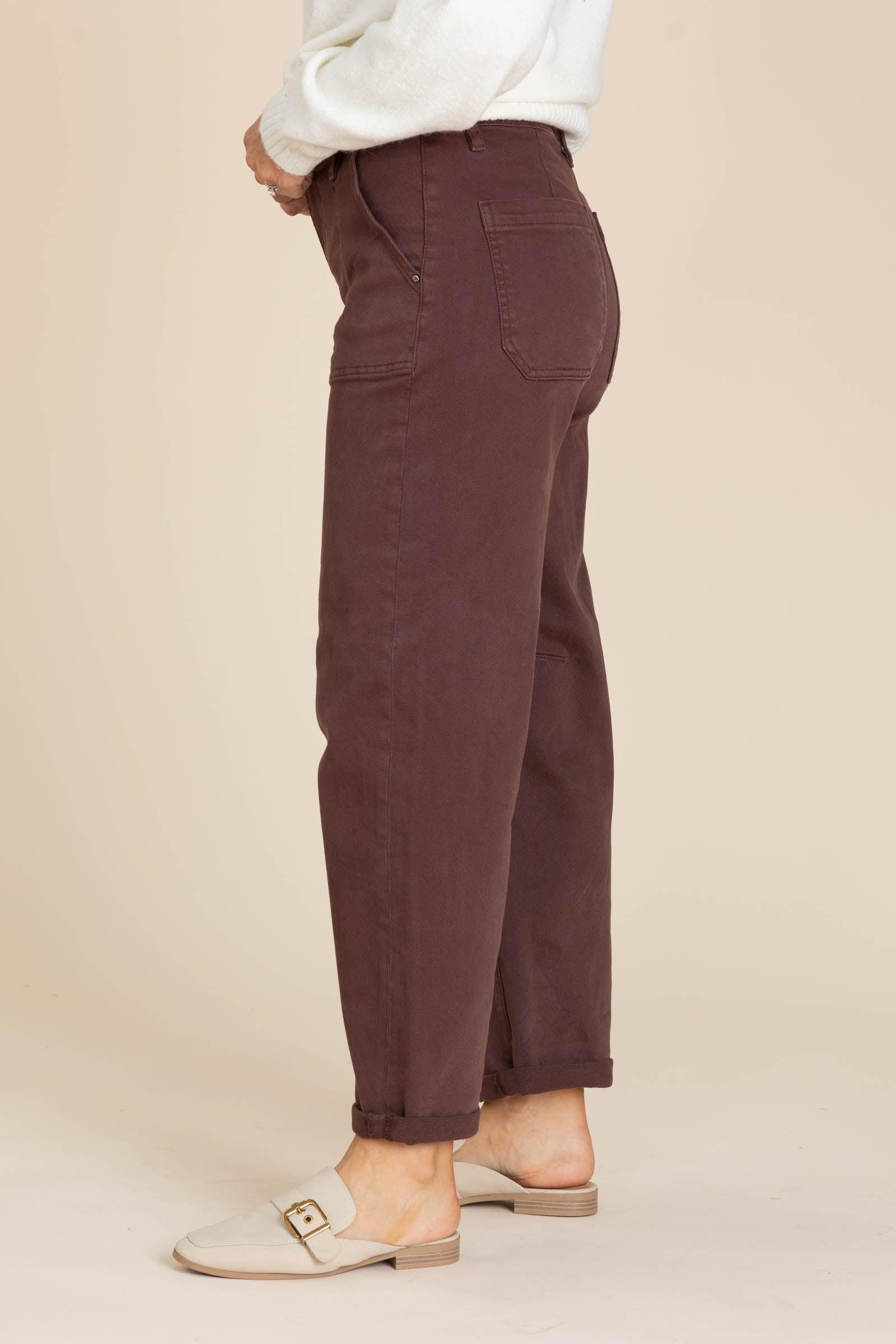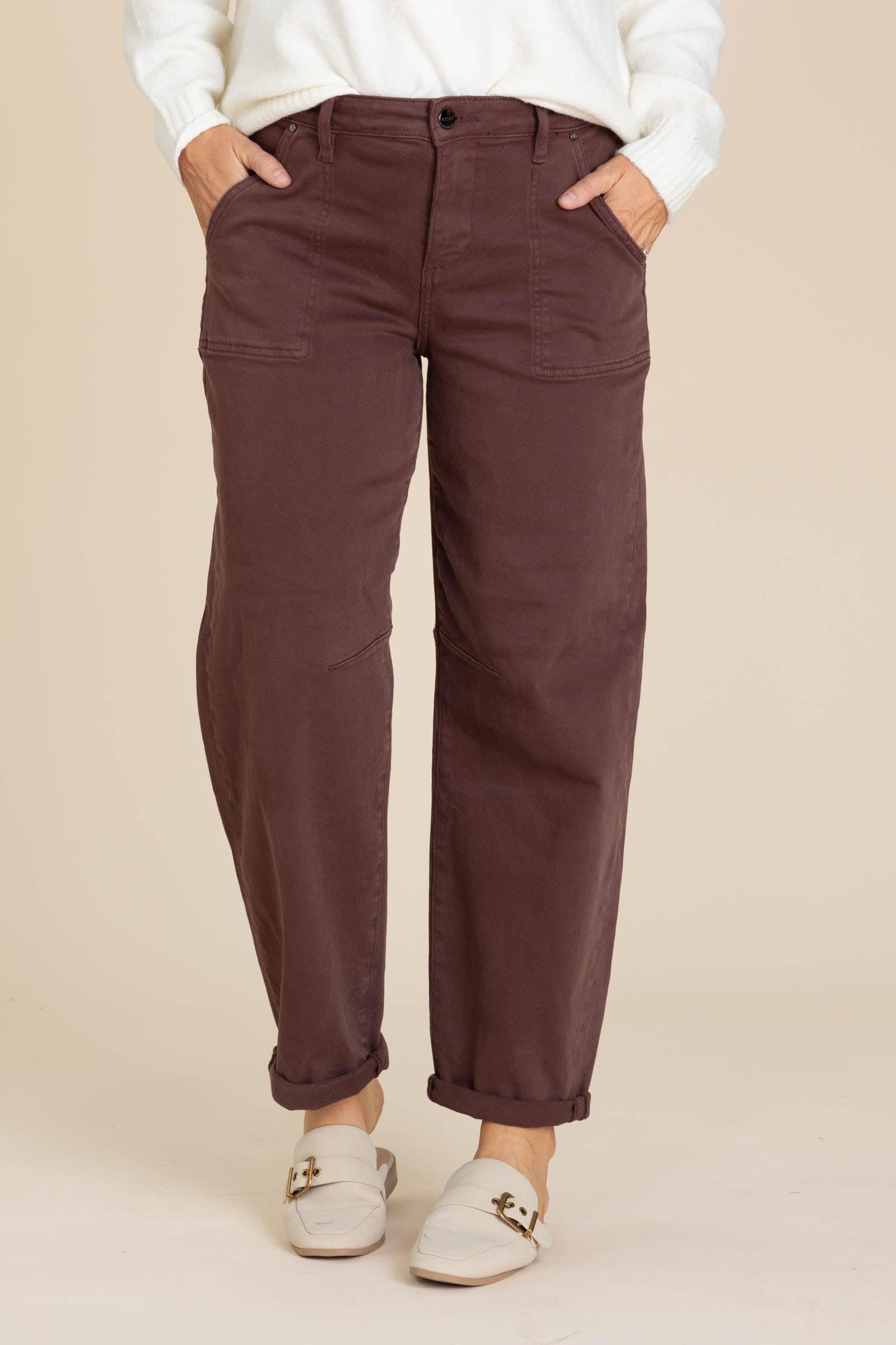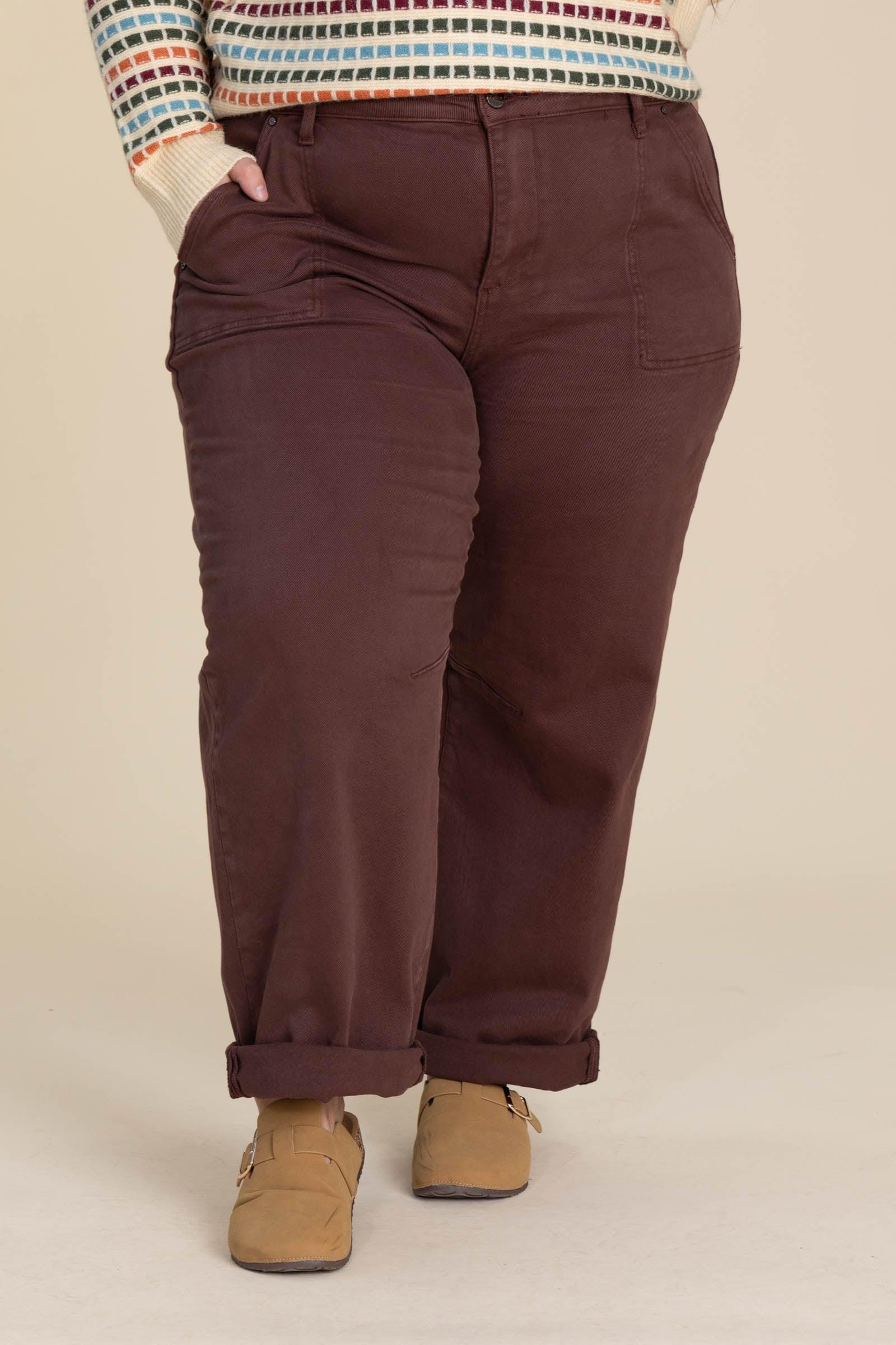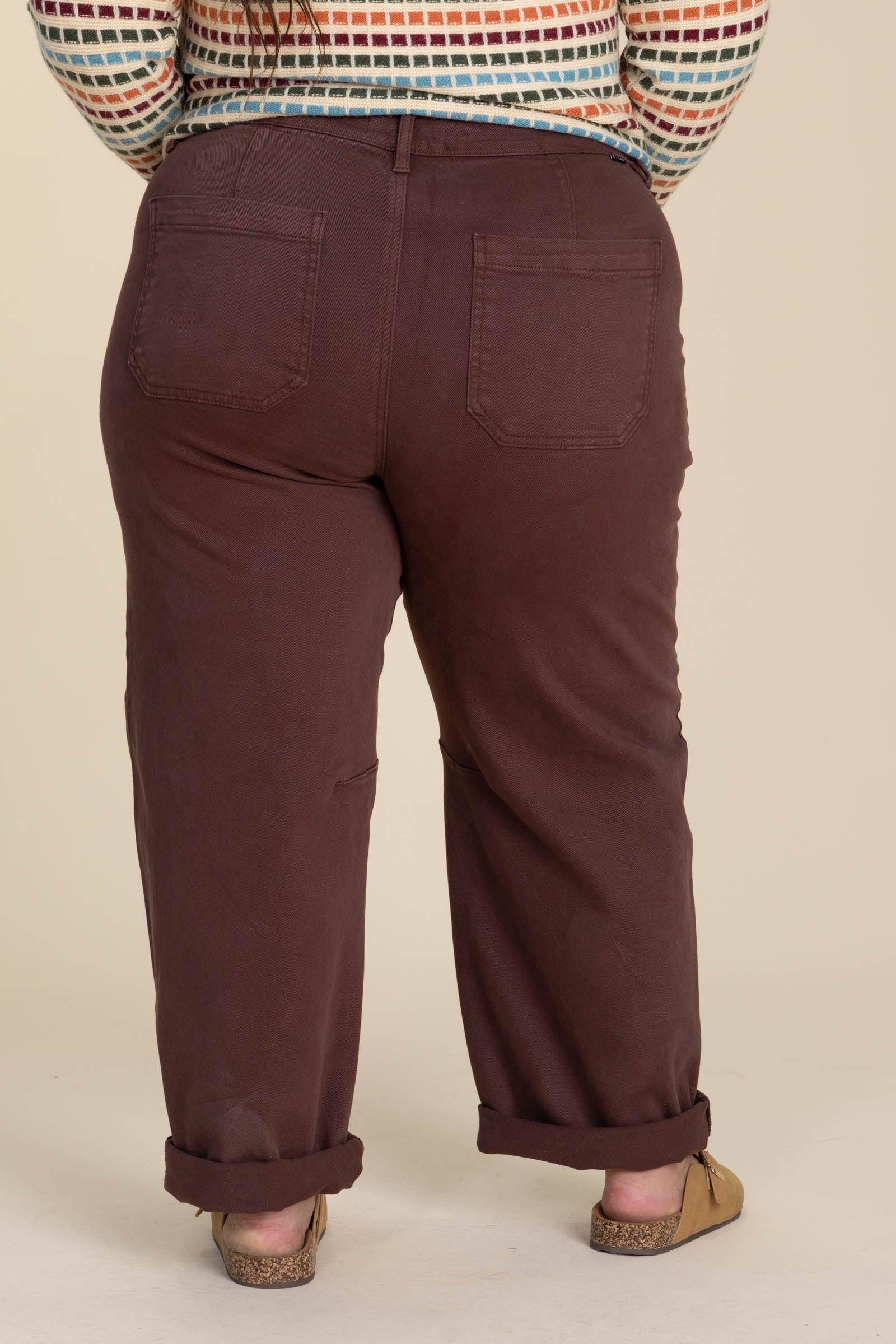 Product Details Color/Wash: Chocolate Rise: High Rise Style: Ankle Wide Barrel Pant Brand: Risen Material and Care 98% Cotton 2% Spandex Machine Wash Cold Hang Dry Size and Fit 0/24 Rise 10" Inseam 30" 3/26 Rise 10.5" Inseam 30" 5/27 Rise 11" Inseam 30" 7/28 Rise 11" Inseam 30" 9/29 Rise 11.5" Inseam 30" 11/30 Rise 11.5" Inseam 30" 13/31 Rise 12" Inseam 30" 15/32 Rise 12.5" Inseam 30" 1X Rise 13" Inseam 30" 2X Rise 13.5" Inseam 30" 3X Rise 14" Inseam 30" Erica is 5'7 and wearing a 5/27 Kristen is 5’2 and wearing her true size 1X