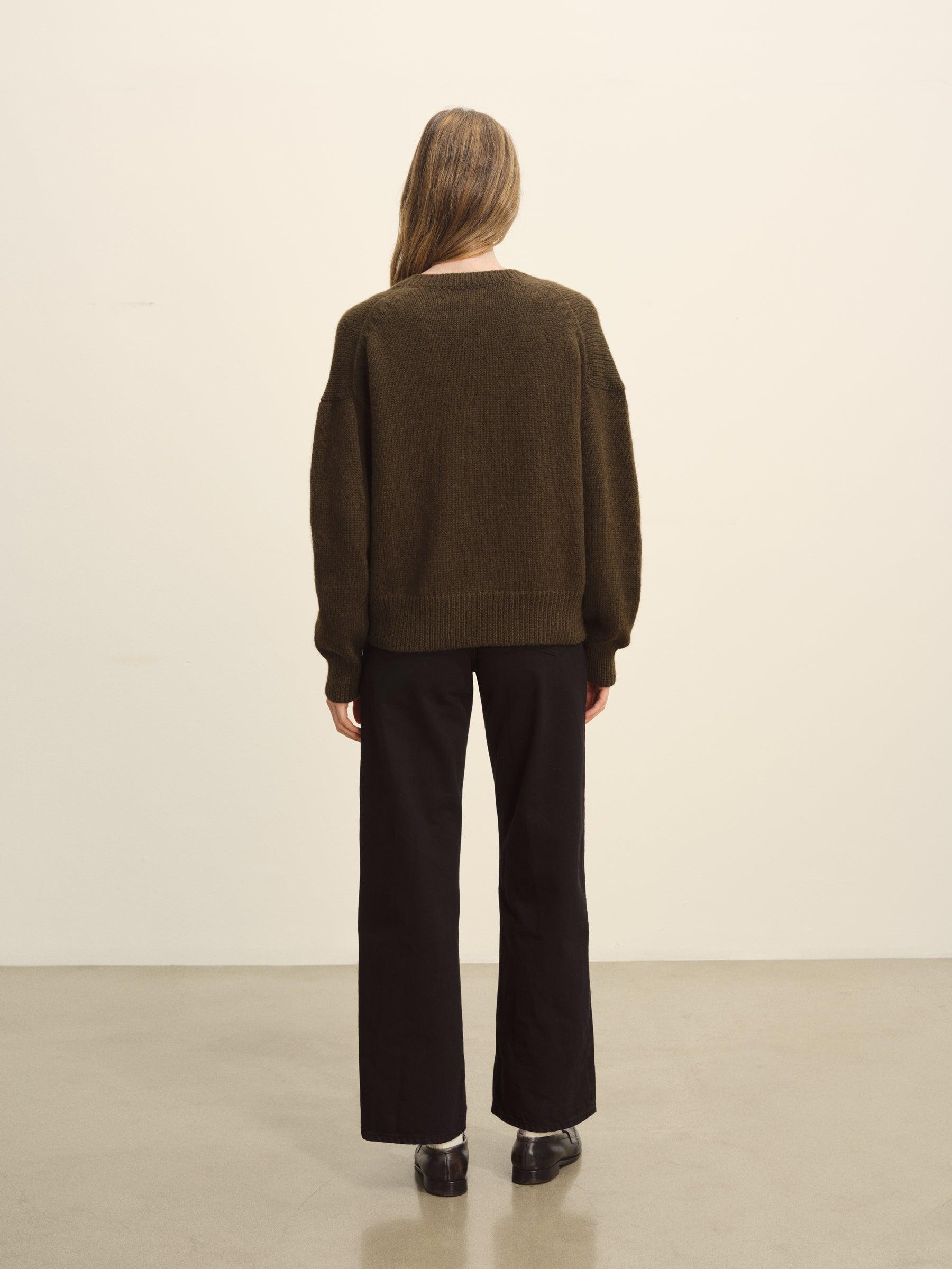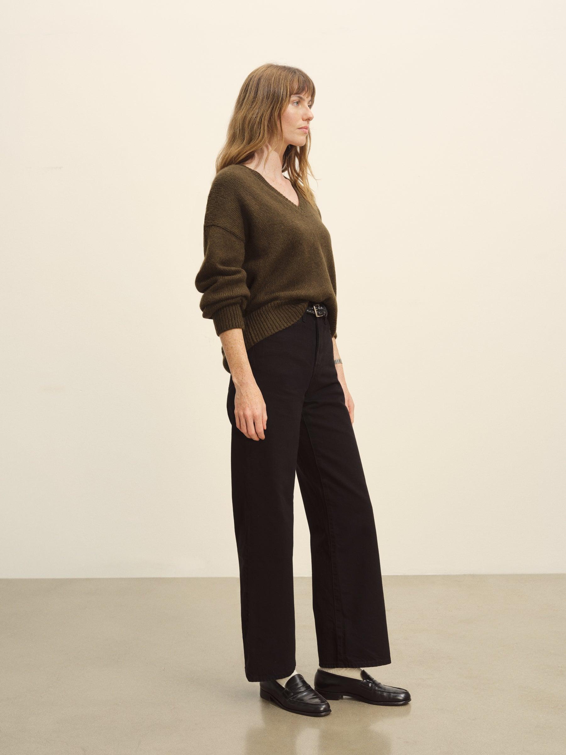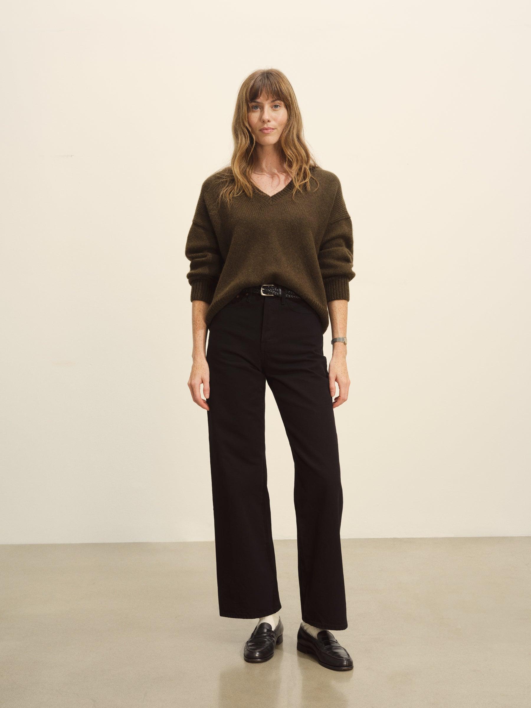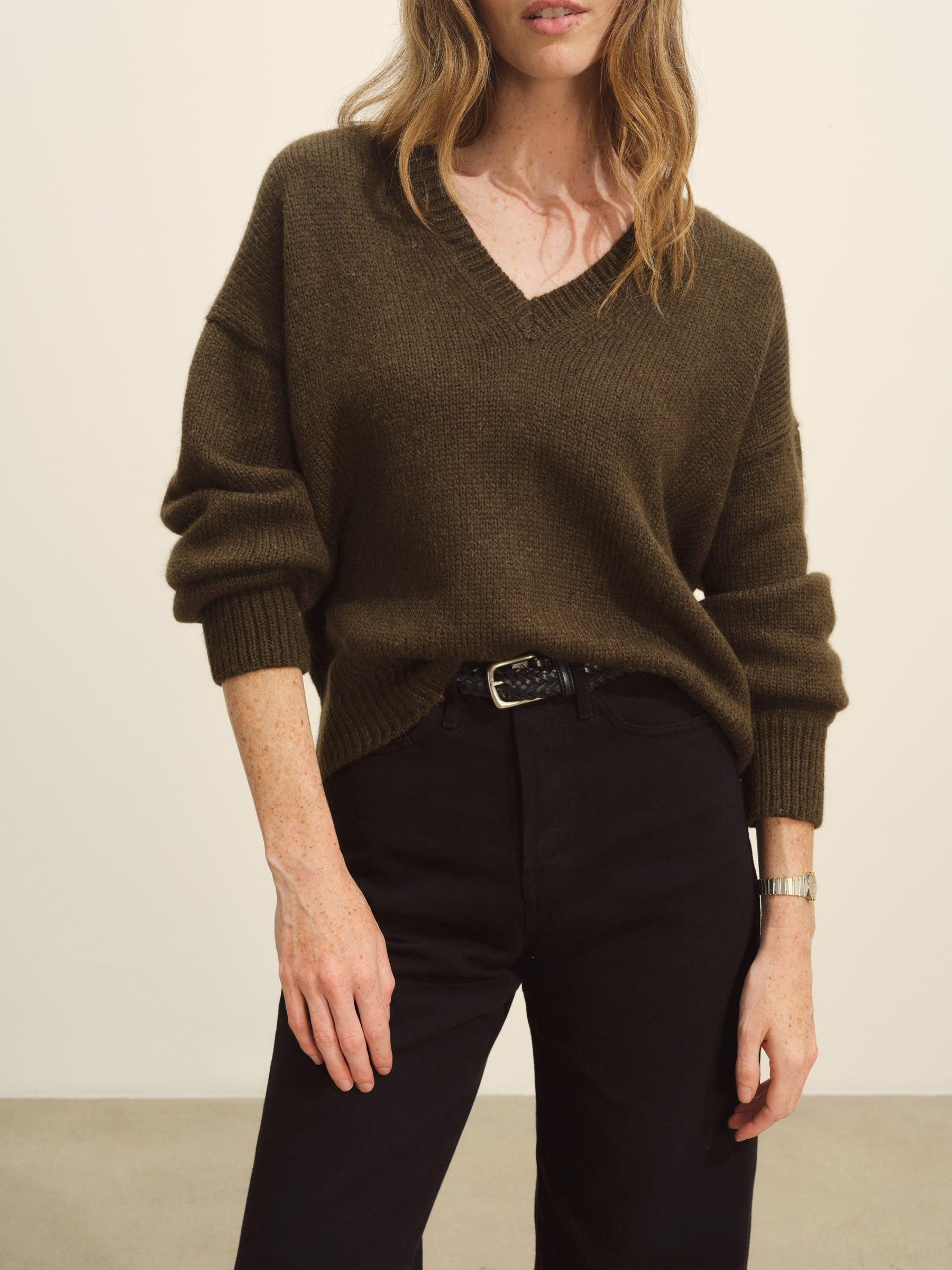 Relaxed V-neck sweater in a five gauge jersey knit from an alpaca/merino wool blend.