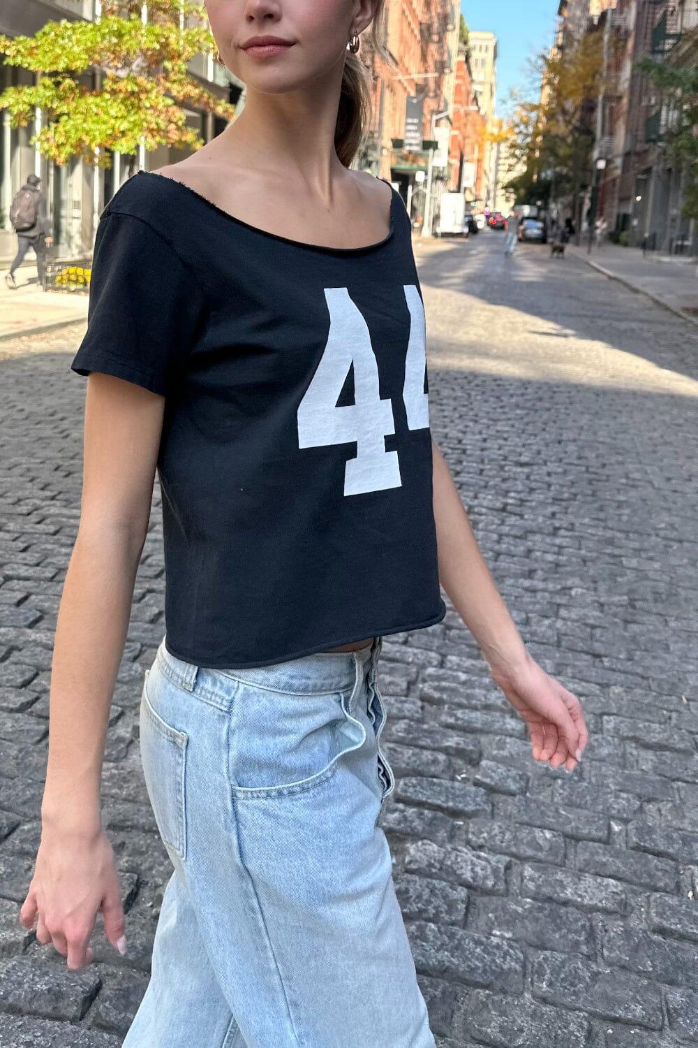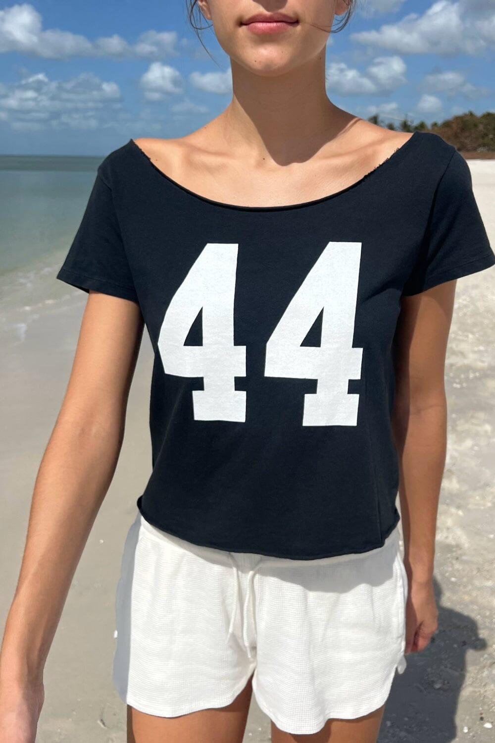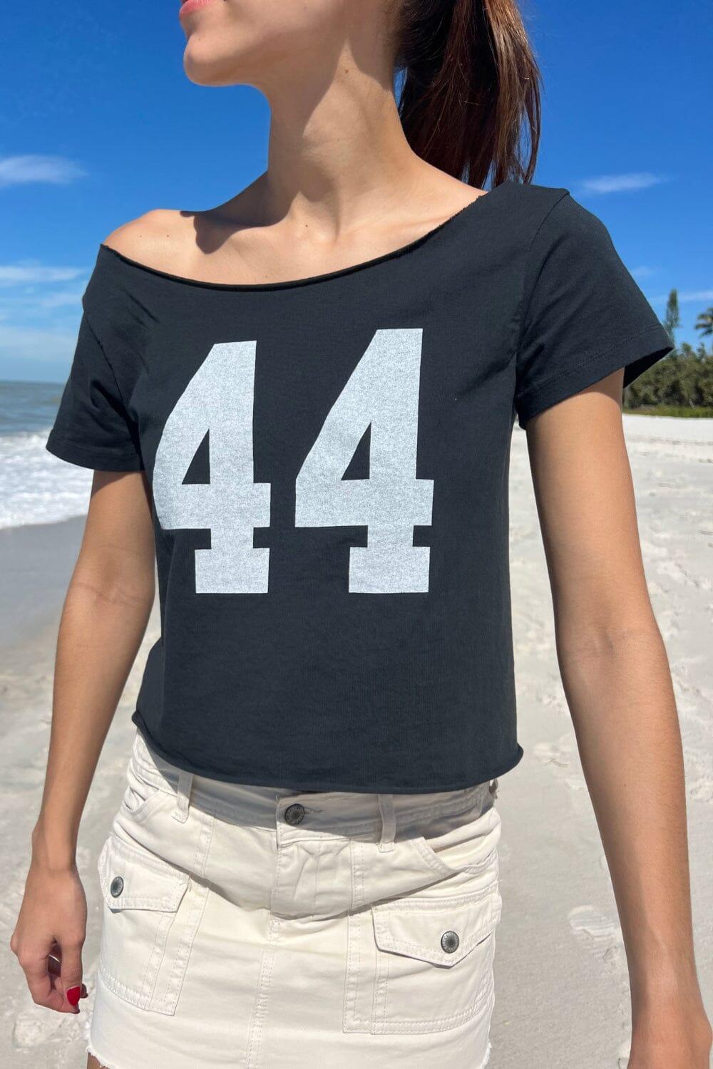 Soft and lightweight cropped wide neck cotton top with raw hem and the 44 graphic printed on the front in white. Fabrics: 100% cotton Measurement: 16.5" (42 cm) length, 17" (43 cm) bust Made in: Europe