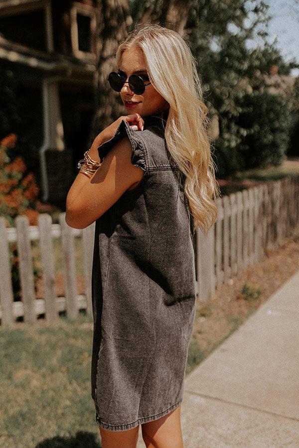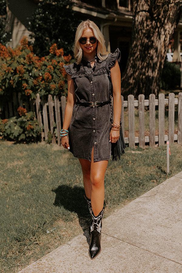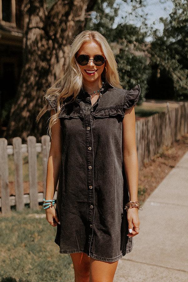 Add an edgy flair to your wardrobe with our vintage black 'Rock Show' dress featuring lightweight denim material, a button down front with a rounded neckline, ruffled cap sleeves, and a flattering silhouette that ends in a straight mid-thigh length hemline!