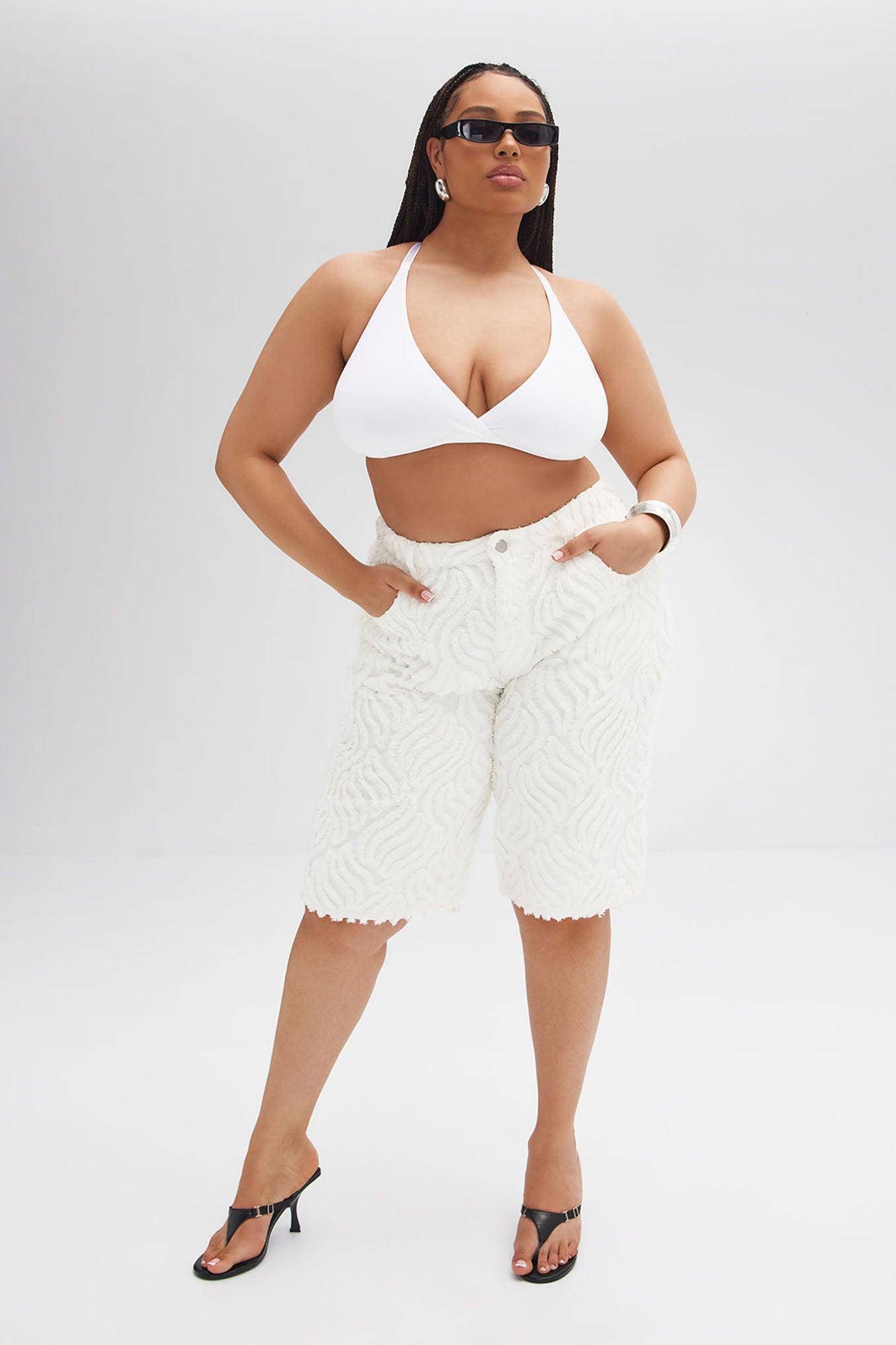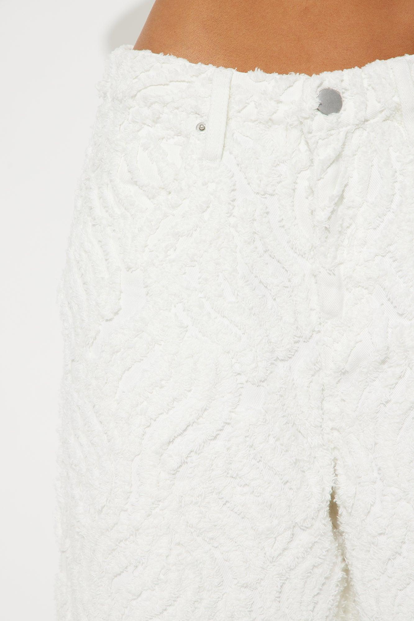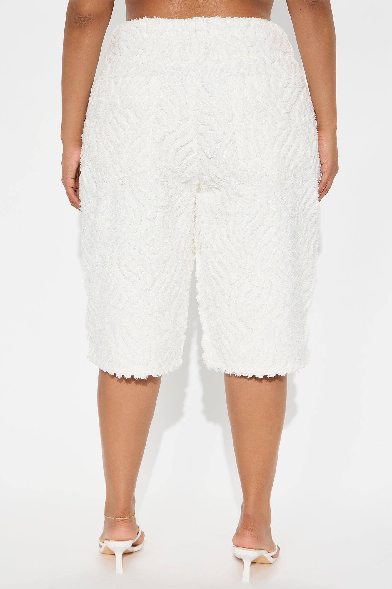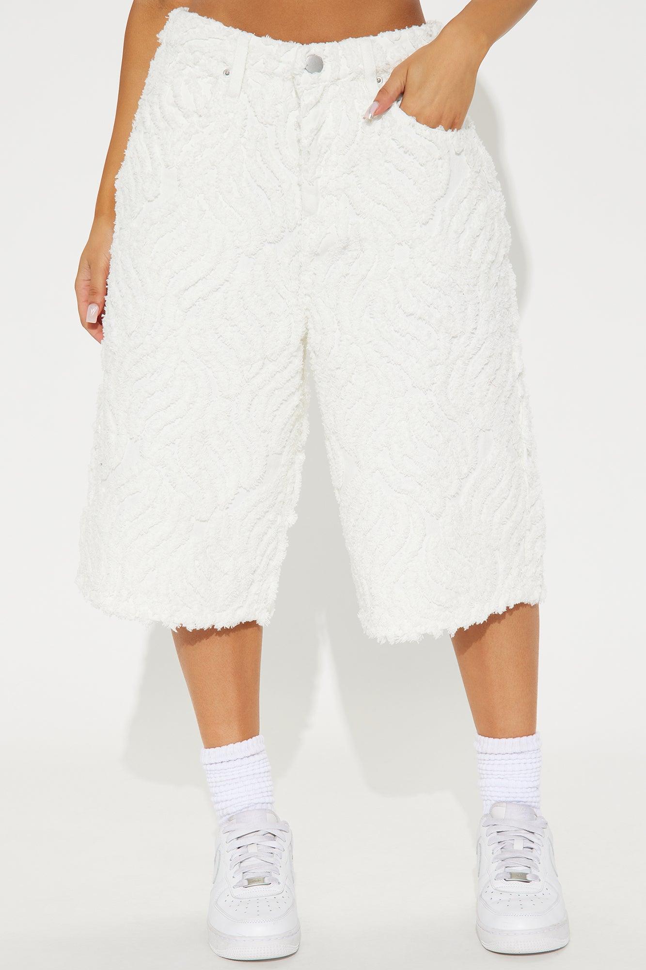 Available In White. Denim Short 5 Pocket Textured Fabric Non-Stretch Drop Waist 12" Rise 14" Inseam Disclaimer: Due To The Distressing Process, Each Garment Is Unique. 70% Cotton 30% Polyester Imported California Proposition 65WARNING: Cancer and Reproductive Harm - www.P65Warnings.ca.gov.