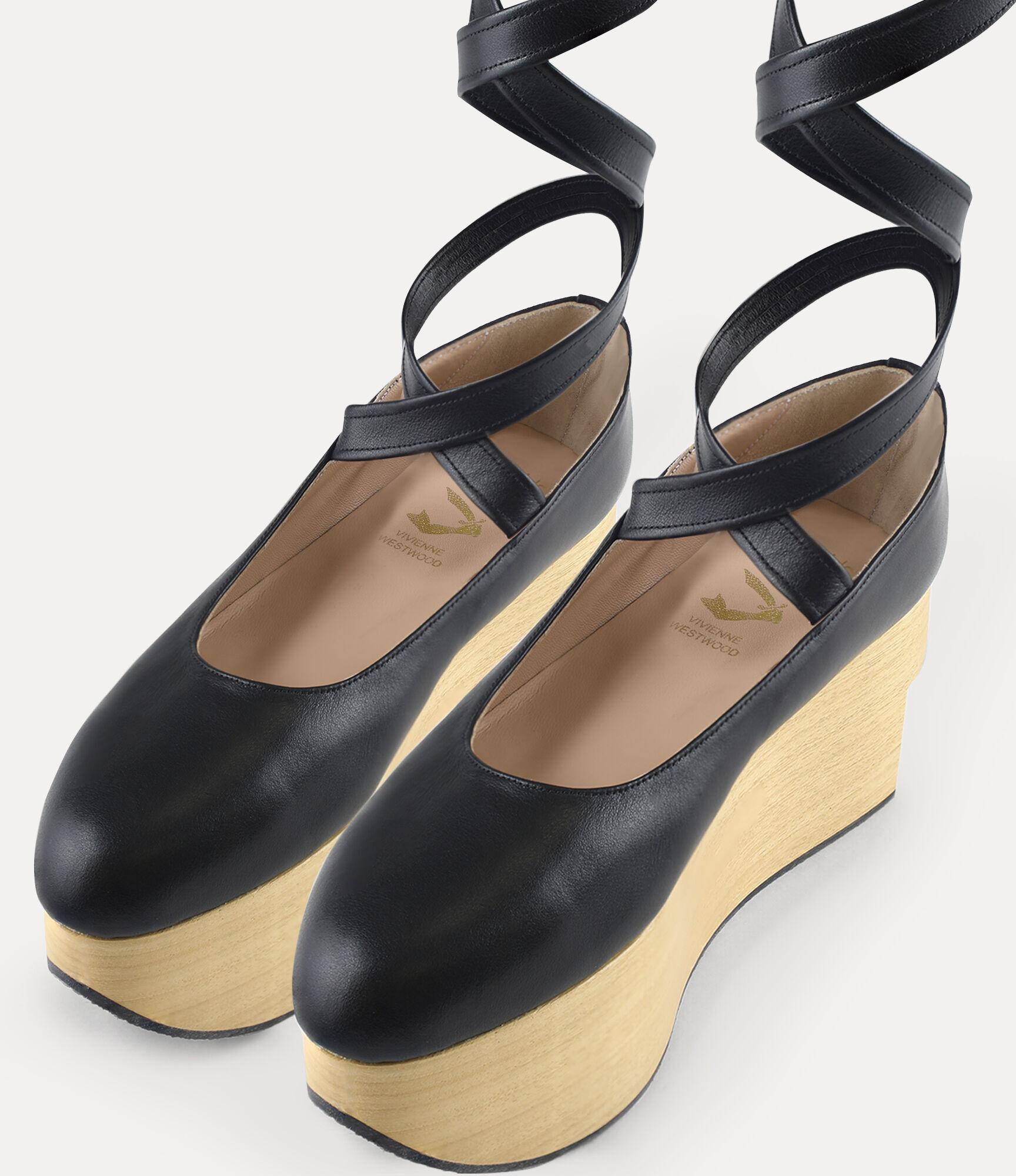 Our Rocking Horse Ballerina shoes were first revealed in the Vivienne Westwood Autumn-Winter ‘87/88 'Harris Tweed' collection, designed to achieve poise and movement. The curved front and cut-out detail in the high wooden platform allows the wearer to rock forwards as they walk, while the delicate leather tie ribbons draw inspiration from ballet pointe shoes.