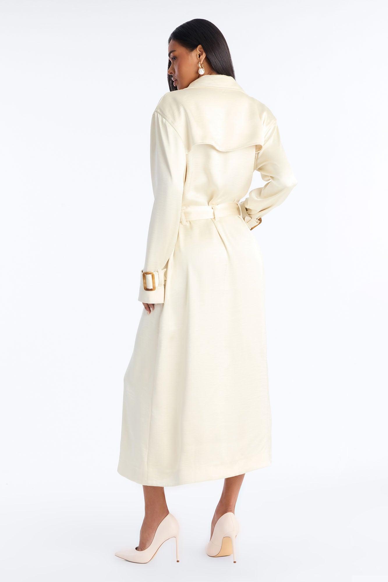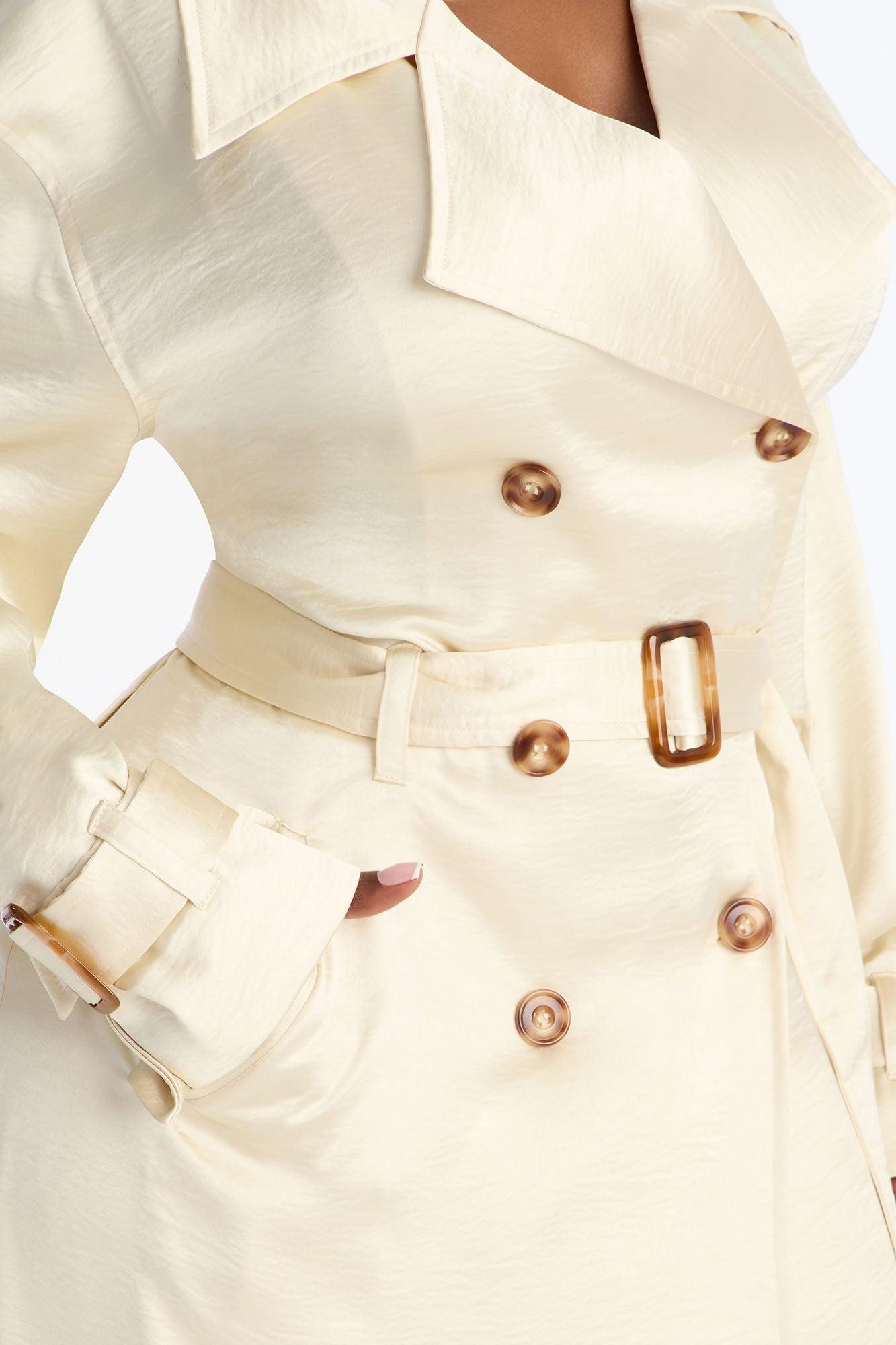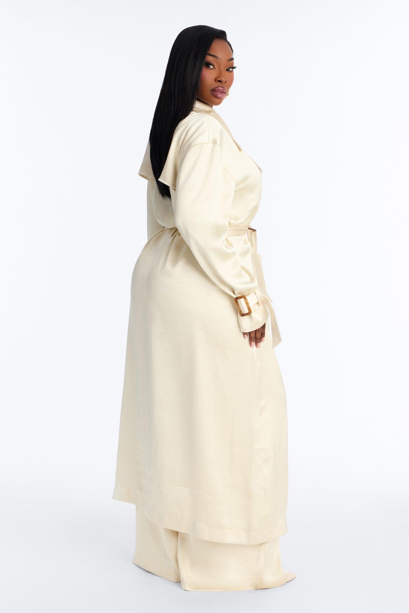 Available In Brown And Off White. Hammered Satin Trench Coat Belted Pair With "Romance Me Satin Trouser" and "Romance Me Satin Lace Trim Cami Top" Self: 96% Polyester 4% Spandex Lining: 96% Polyester 4% Spandex Imported California Proposition 65WARNING: Cancer and Reproductive Harm - www.P65Warnings.ca.gov.