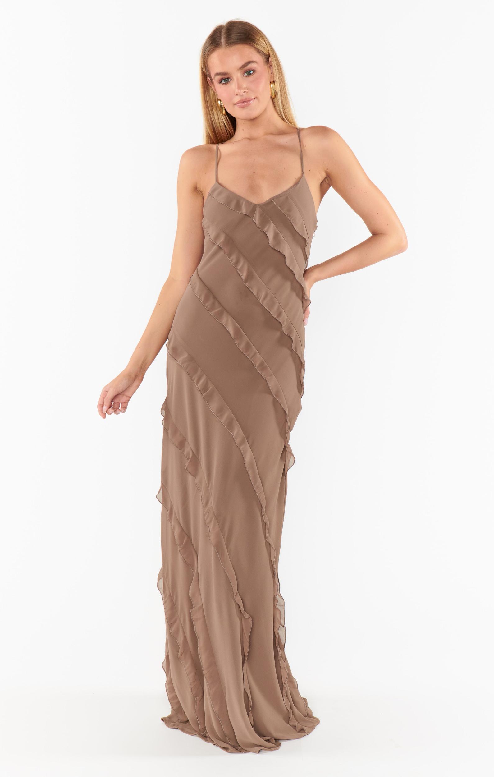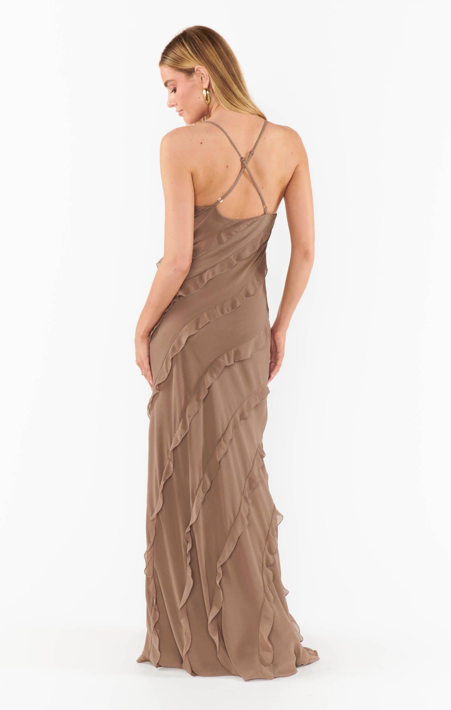 The Romance Ruffle Dress is a floor length slip dress that drapes in the most flattering way. The ruffle detailing adds a bit of flirty fun to any affair. Whether you're a bridesmaid, bride, or guest this new maxi will be the formal dress you keep coming back to.