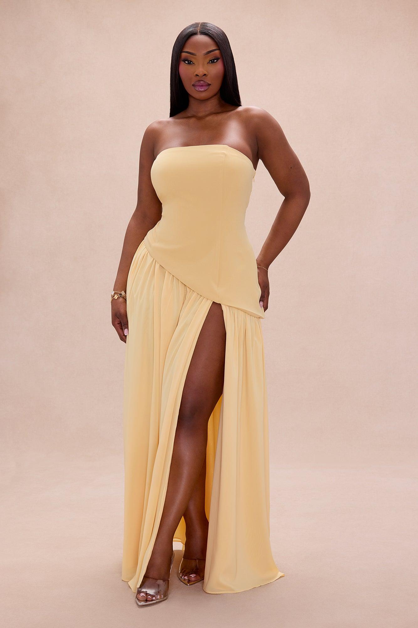 Available In Burgundy, Butter Yellow, Mauve And Navy. Maxi Gown Strapless Straight Neckline Grip Tape Asymmetrical Top Chiffon Skirt Slit Lace Up Back Hidden Side Zipper Lined Stretch Self/Contrast: 95% Polyester 5% Spandex Lining: 100% Polyester Imported