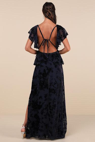 Feel the admiration bloom as you stride through your next event in the Lulus Romantic Wonder Navy Burnout Velvet Ruffled Tie-Back Maxi Dress! This ethereal dress has an airy chiffon fabrication, adorned with a burnout velvet floral design, that shapes short flutter sleeves that frame a plunging scoop neckline and a triangle-style bodice. The high, empire waist cascades into a figure-skimming, A-line skirt with a sweeping maxi hem and a side slit. Ruffled panels accent the sides and below the open back design that boasts a strappy, tying detail. Elastic and hidden zipper/clasp at back.