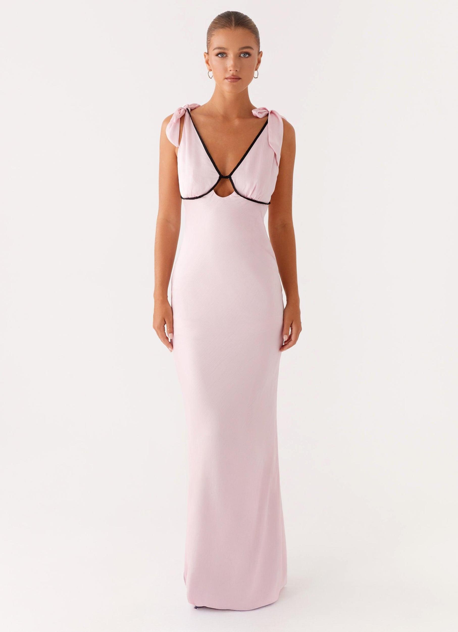 Peppermayo ExclusiveThe Romeo Maxi Dress exudes elegance with its stunning V-neckline and matching V-back design. This flattering silhouette is perfect for any occasion, whether it's a formal event or a night out. The soft, flowing fabric ensures comfort while maintaining a chic, sophisticated look.- V neckline - Underbust window - Invisible side seam zipper - Tie up shoulder straps - V back neckline - Black piping along neckline - Maxi length - Textured satin fabric - Bias cut - 70% Tencel, 30% polyester, L: 100% polyesterSize AU 8 / US 4 garment measurements:Bust: 76 cm / 29.92 inWaist: 70 cm / 27.56 inHip: 94 cm / 37.01 inLength: 151 cm / 59.45 inYasmin is 174cm and wearing a size AU 6 / and US 2