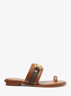 Add a fusion touch to your attire wearing the MICHAEL Michael Kors Rory Flat Thong. Polyurethane and polyester upper. Polyurethane blend lining. Synthetic footbed. Slip-on style with toe loop design. Metallic brand detailing on the strap. Open round toe design. Low stacked heel. Rubber outsole. Imported. Measurements: Heel Height: 1 4 in Product measurements were taken using size 7, width M. Please note that measurements may vary by size.