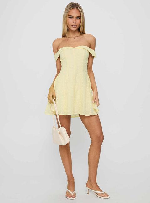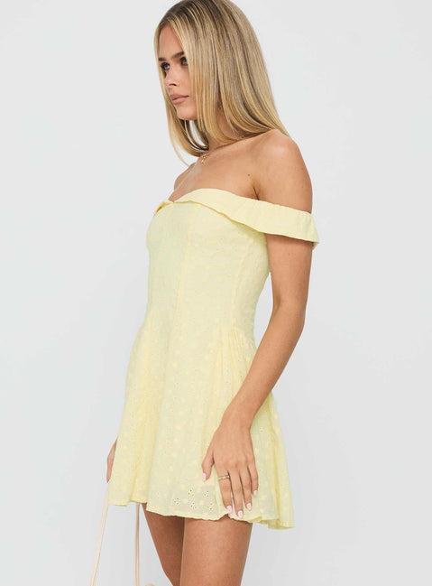 Broderie off-shoulder mini dress Folded-over bust, silicone lining inside bust, pleated hem, elasticated shoulders, invisible zip fastening at back Non-stretch material, fully lined Main: 100% cotton, Lining: 100% rayon Cold gentle machine wash