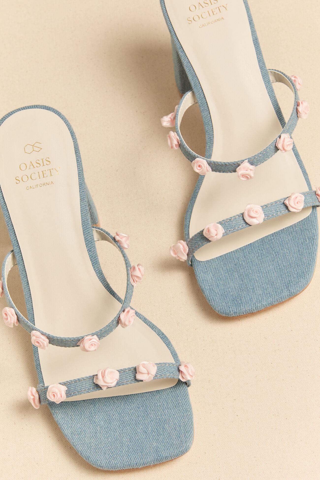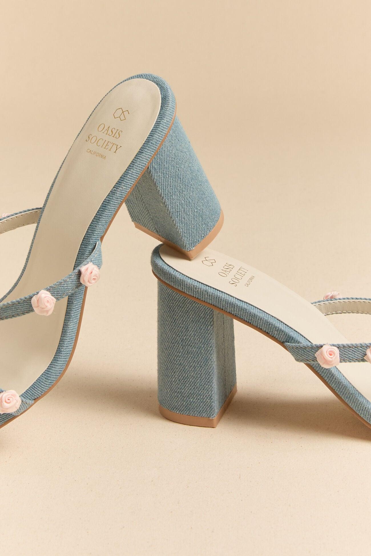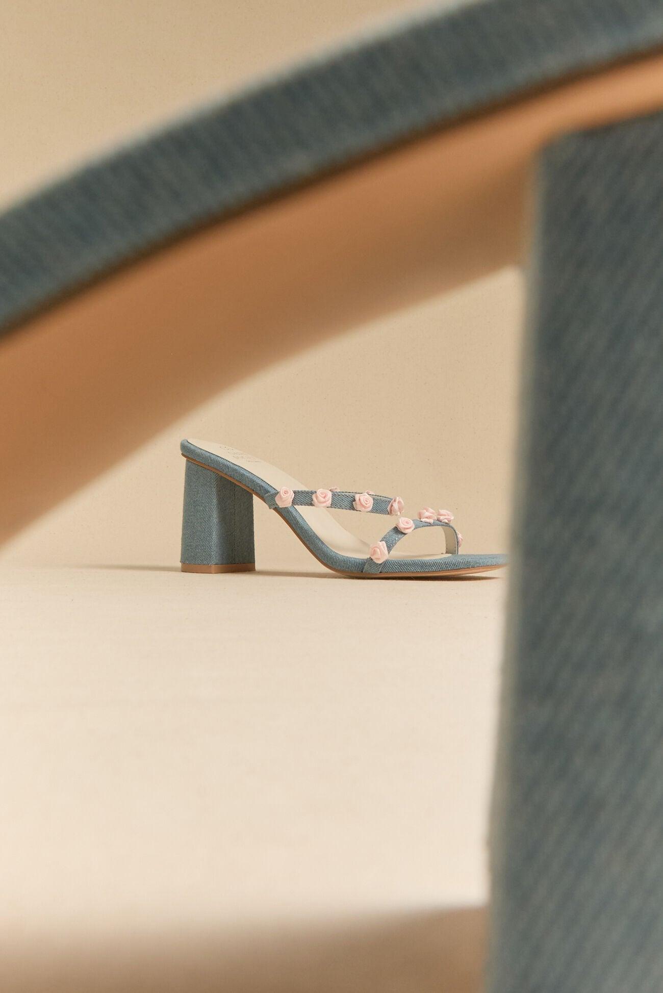 Step into statement style with these charming denim rosette heels. Designed with two sleek straps and feminine rosette details, these heels bring the perfect mix of playful and polished.