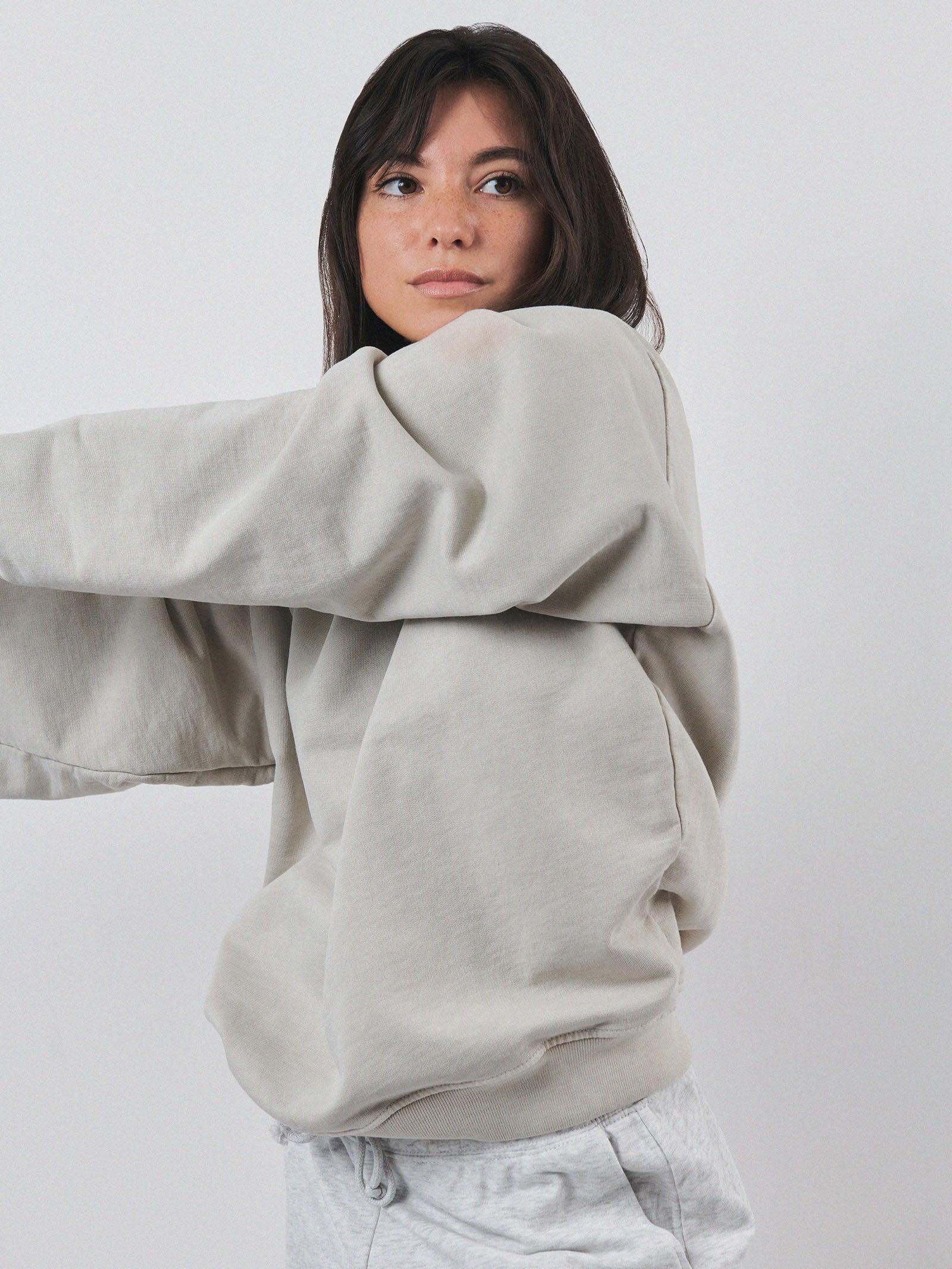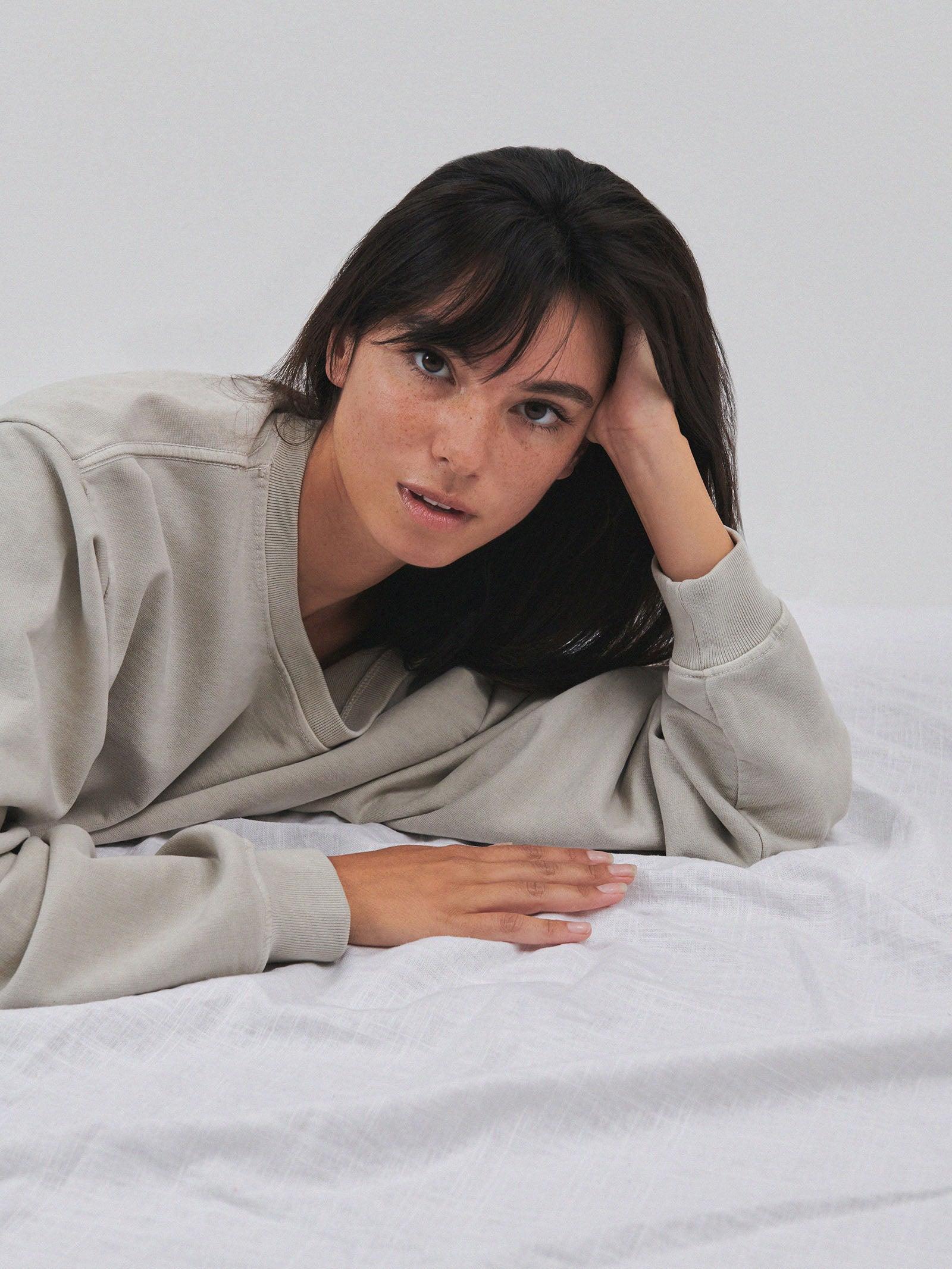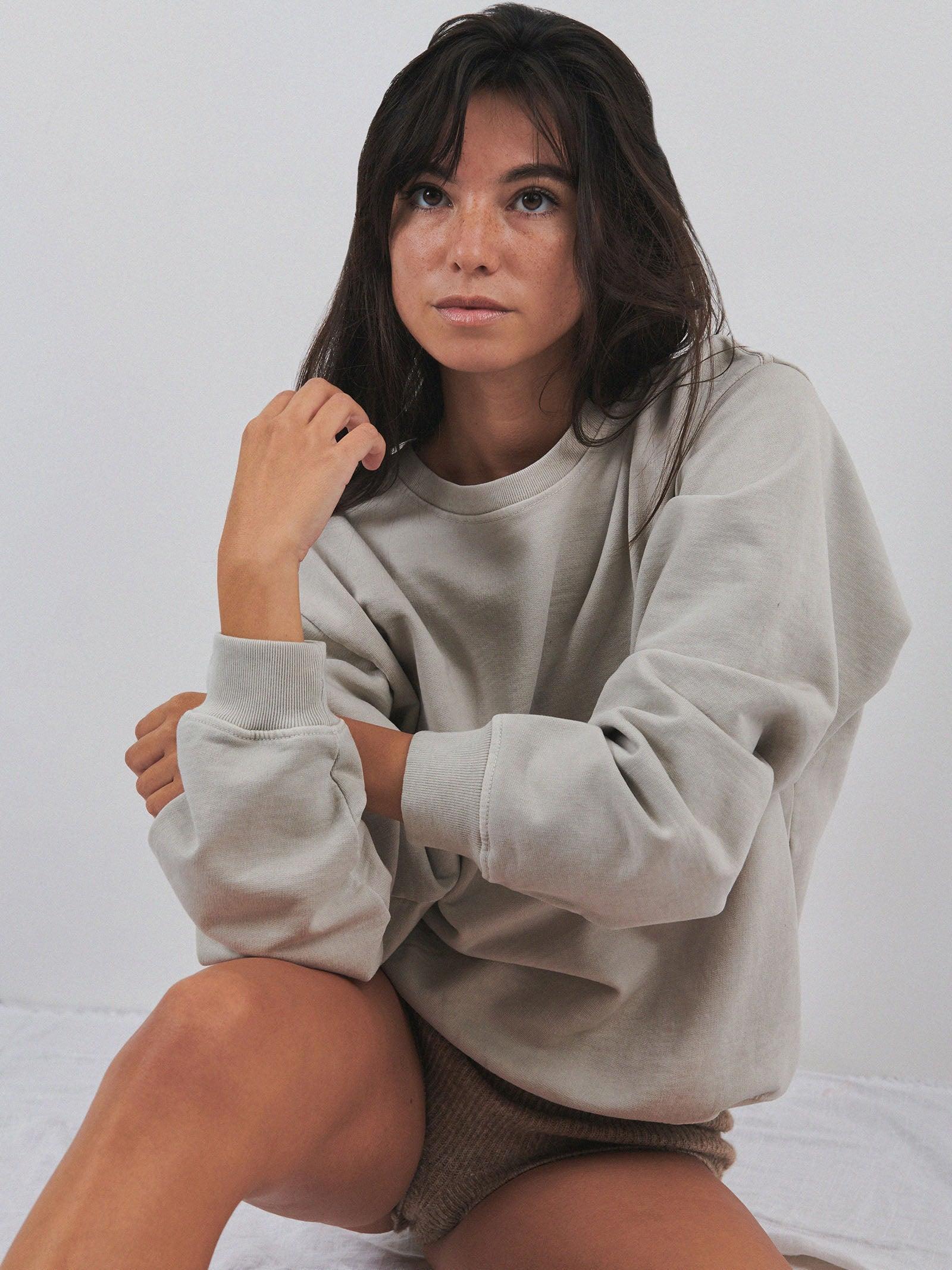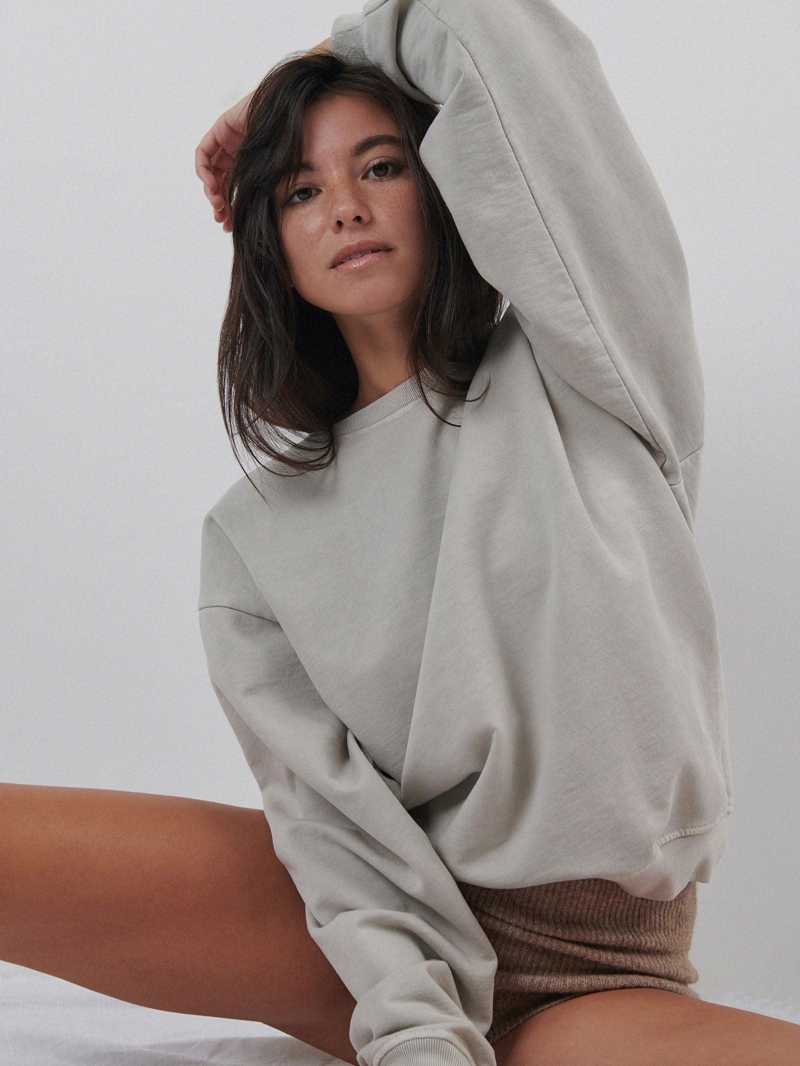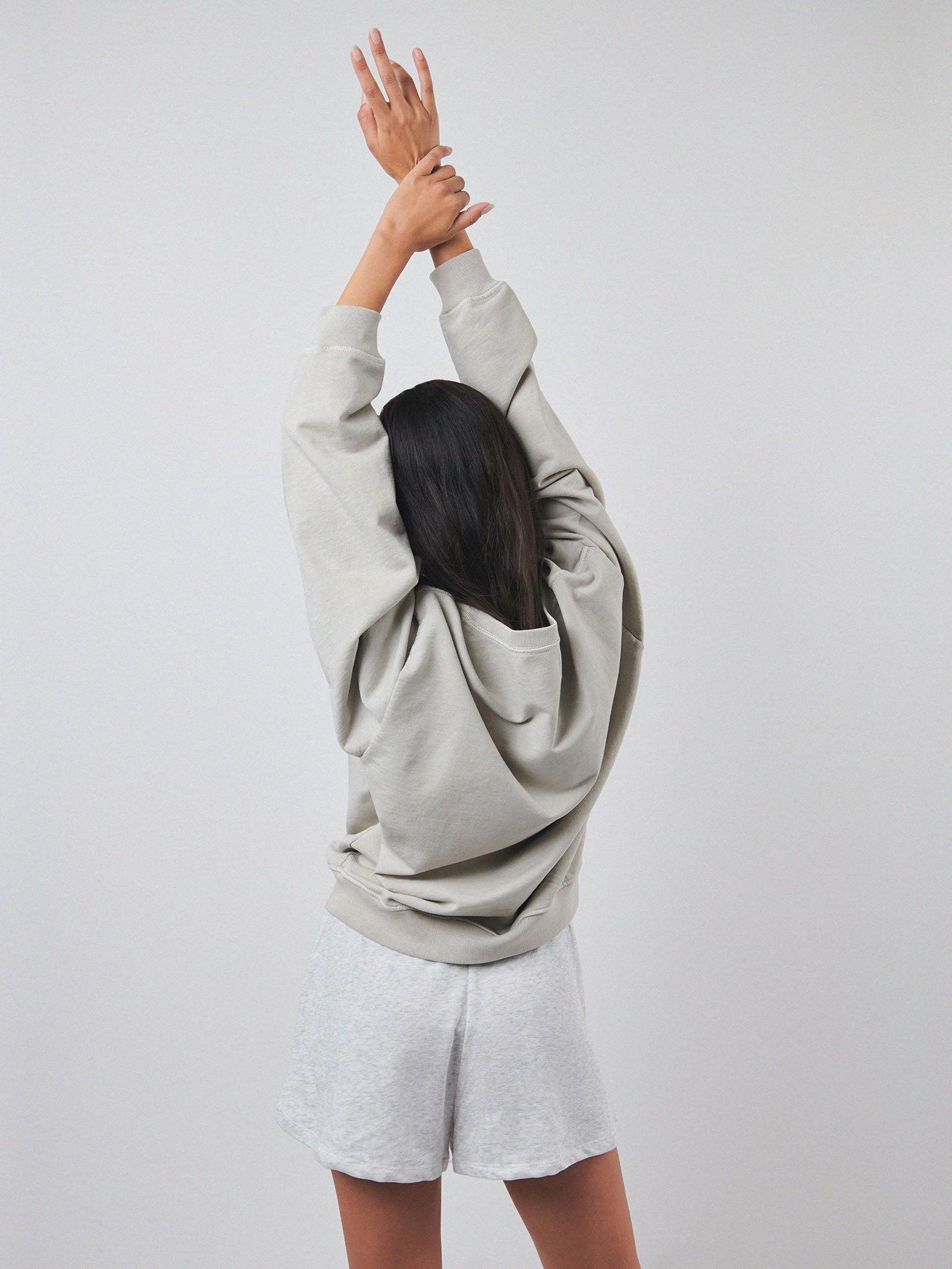 The Rosewood crewneck sweatshirt is constructed from luxurious French Terry fabric, knitted using premium cotton yarn with a special, compact finish. The garment is dyed using an age-old artisanal technique, ensuring every piece is unique. It features a relaxed, contemporary silhouette with oversized draping sleeves and a dropped shoulder. It fits like a cropped, modern interpretation of a vintage collegiate jumper.