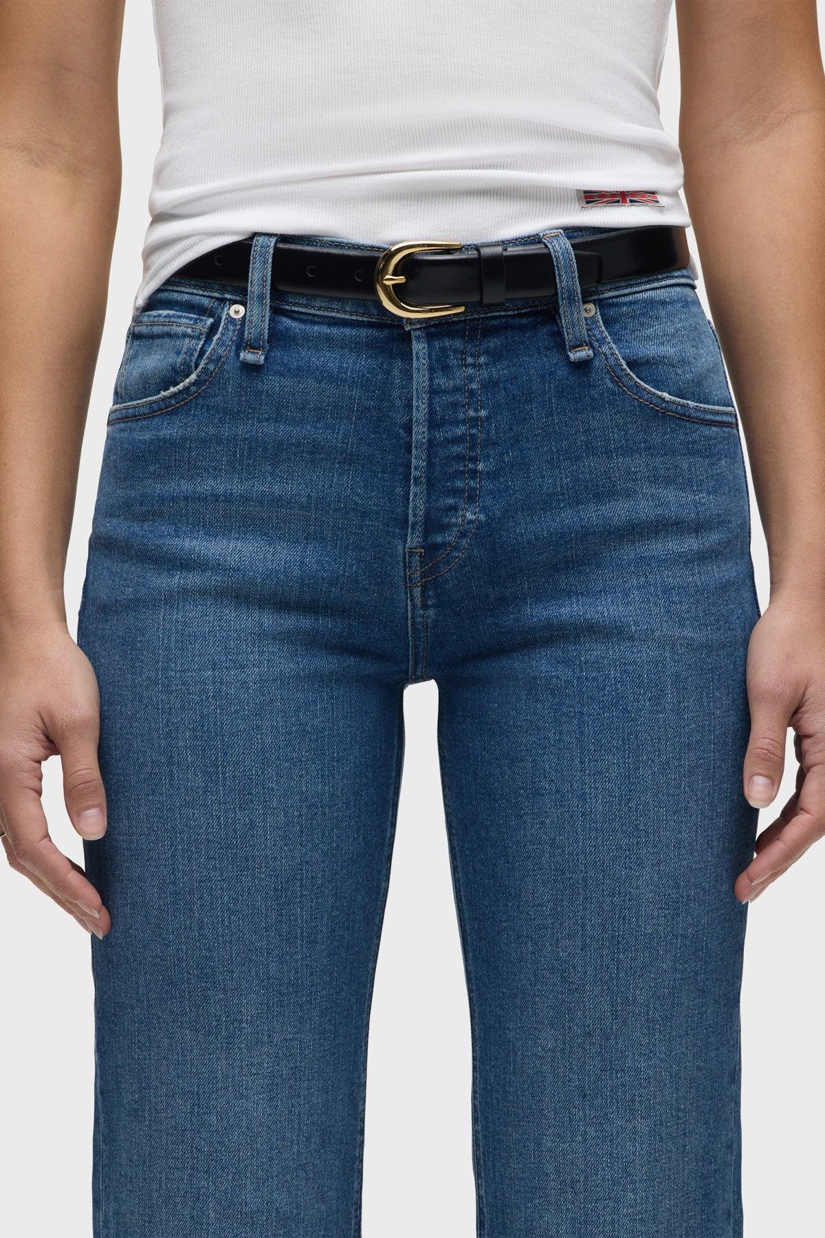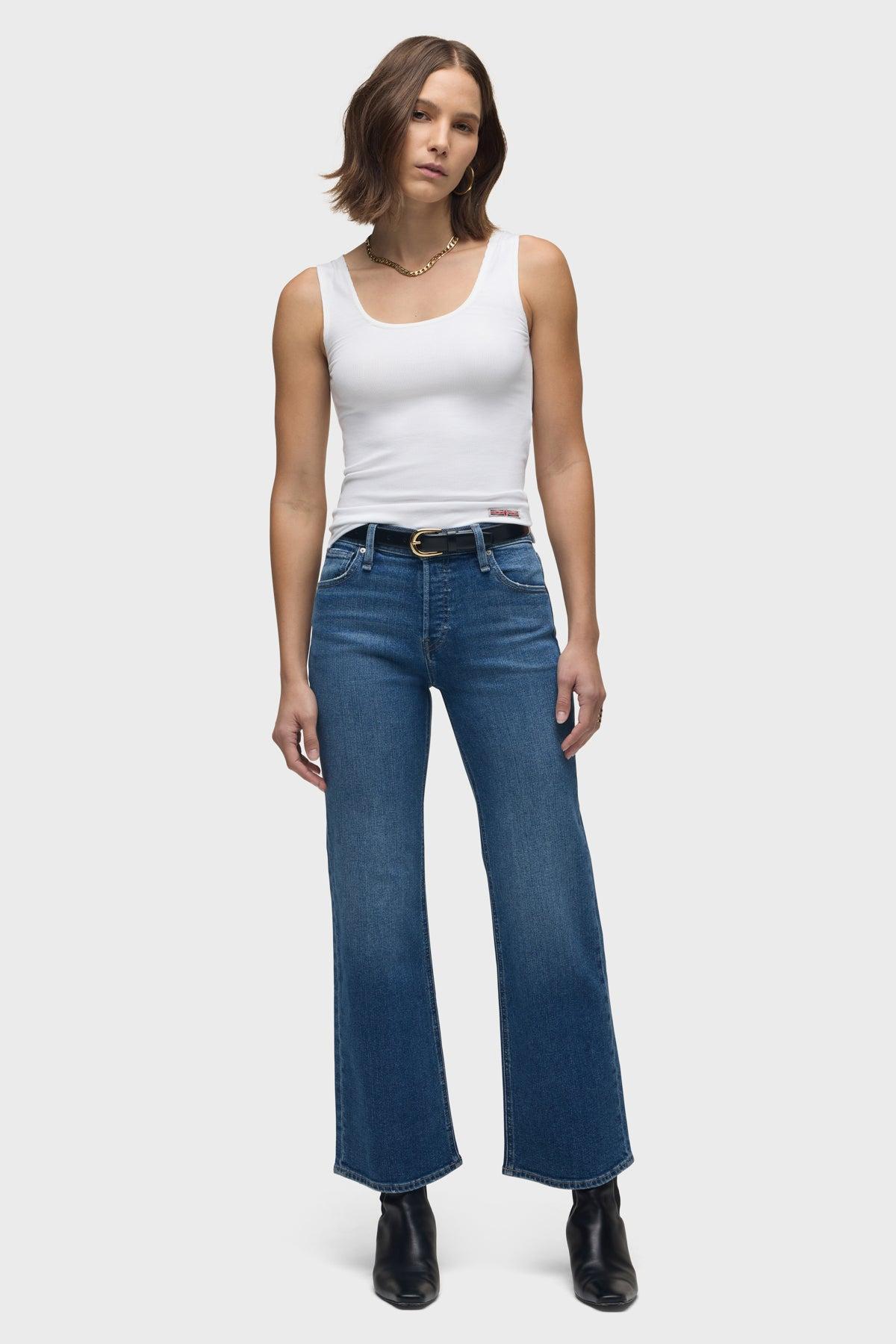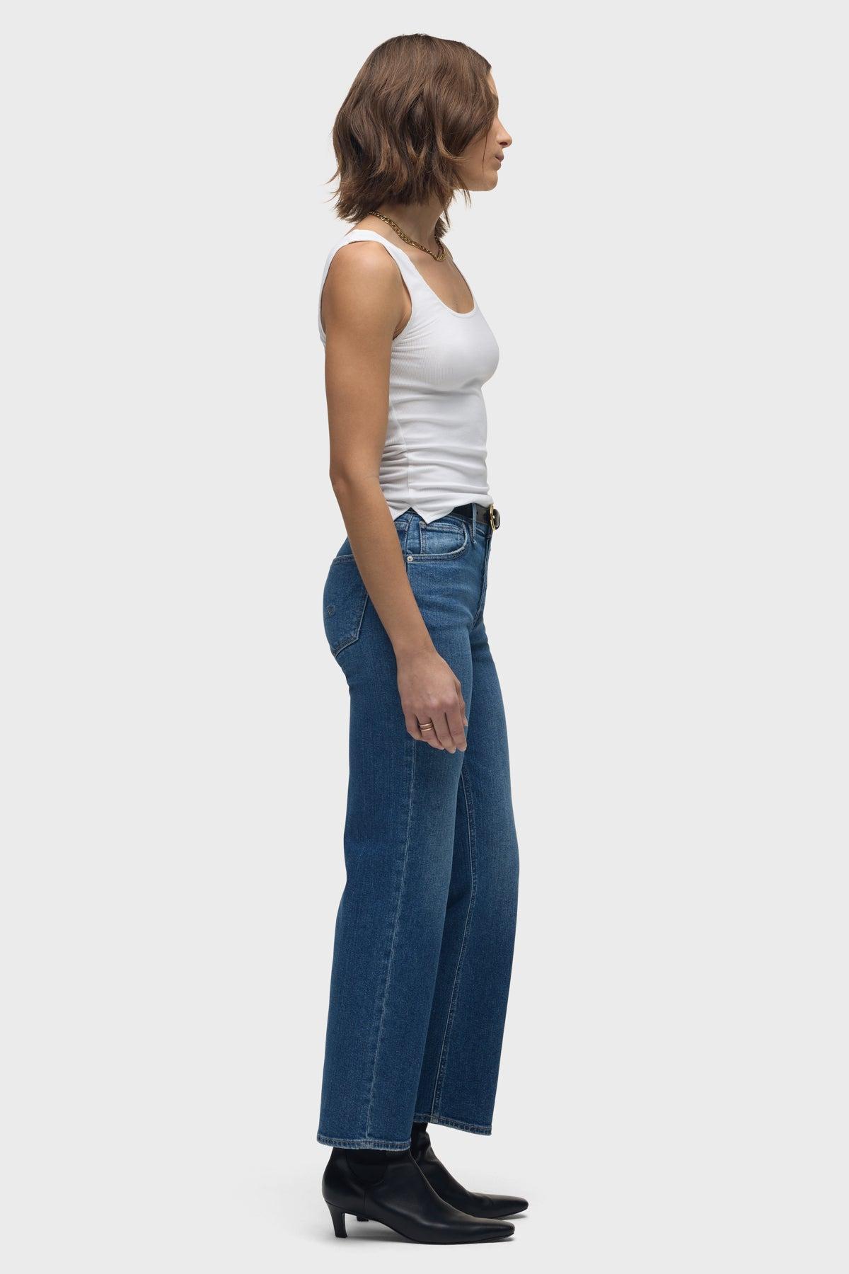 Description Re-up with our Rosie High-Rise Wide Leg Ankle Jean, cut with an elevated waistline and ankle-length, roomy leg. Crafted from premium comfort stretch denim that's been expertly washed to a medium indigo with edge grinding, covered button fly and classic five-pocket details. Product Details Front Rise: 10.25", Leg Opening: 20", Inseam: 29"Model Height 5'9"Model wearing size 25Measurements based on size 27 Fit & Care Content: 95% Cotton, 3% Elasterell-P, 2% ElastaneMachine wash cold with like colorsDo not bleachTumble dry low or hang to dry