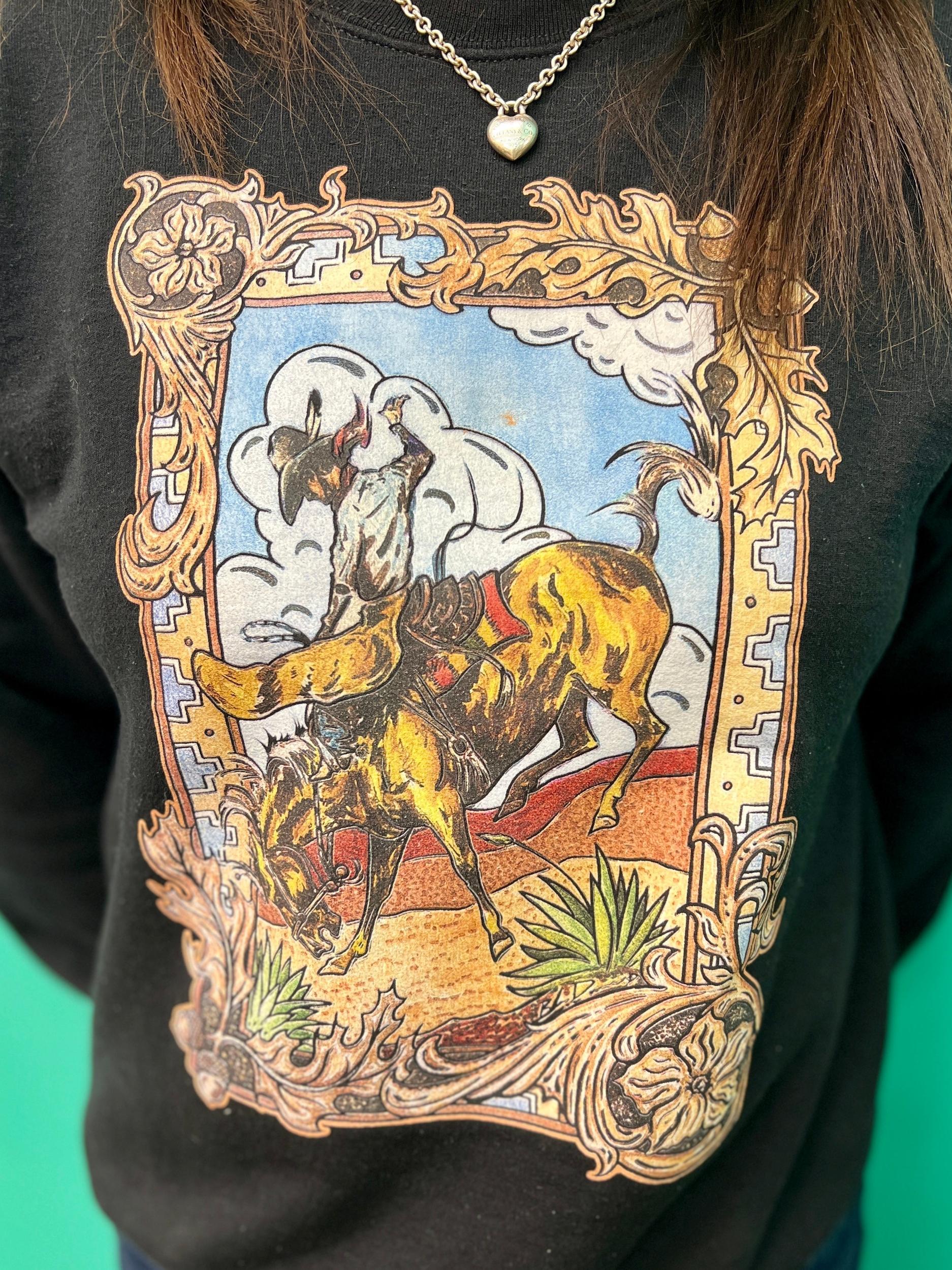 The Bronc by Blu is your perfect rodeo-ready ride! Keep warm and look wild with this black sweatshirt featuring a tooled boarder of a bucking bronc and a classic Western desert background. Yeehaw! 50% Cotton 50% Polyester SIZE CHEST LENGTH SLEEVE WIDTH SLEEVE LENGTH S 20" 26" 2.5" 29.5" M 21" 27" 3.5" 30.5" L 23" 28" 3.5" 31.5" XL 25.5" 29" 3.5" 32.5" 2X 27" 30" 3.5" 33" 3X 28" 31" 3.5" 33.5"