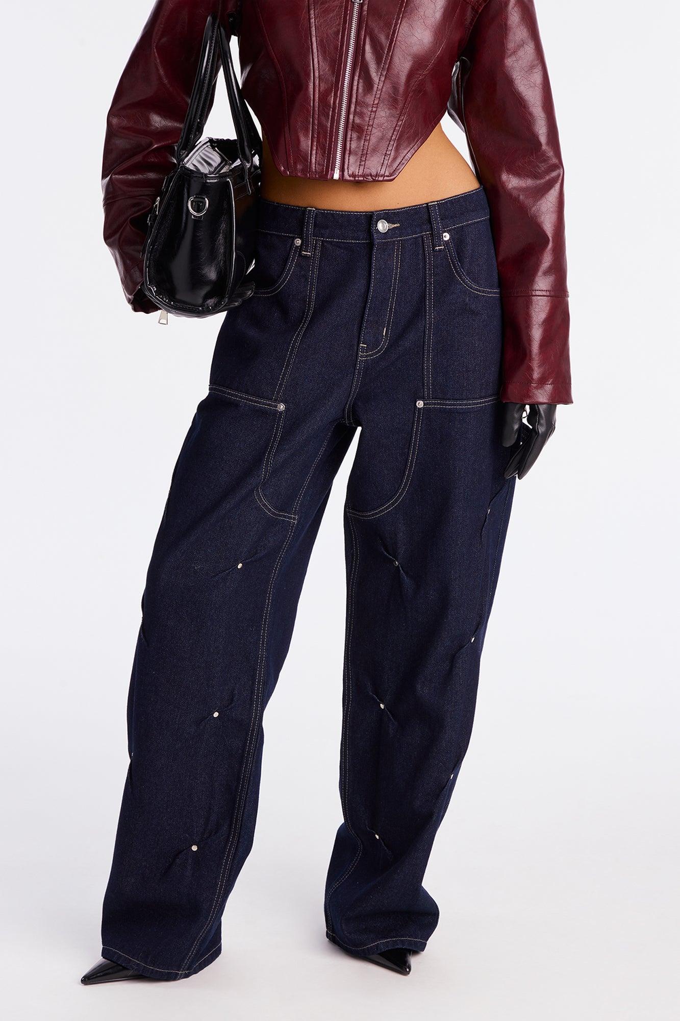 Available In Dark Denim. Straight Leg Jean Utility Detail Pockets 11.5" Rise 32" Inseam Non Stretch Disclaimer: Due To The Specialized Wash Process, Each Garment Is Unique. Disclaimer: Due the To The Specialized Dye Process, Loose Dye Can Stain On Contact. Do Not Wash with Other Garments 100% Cotton Imported