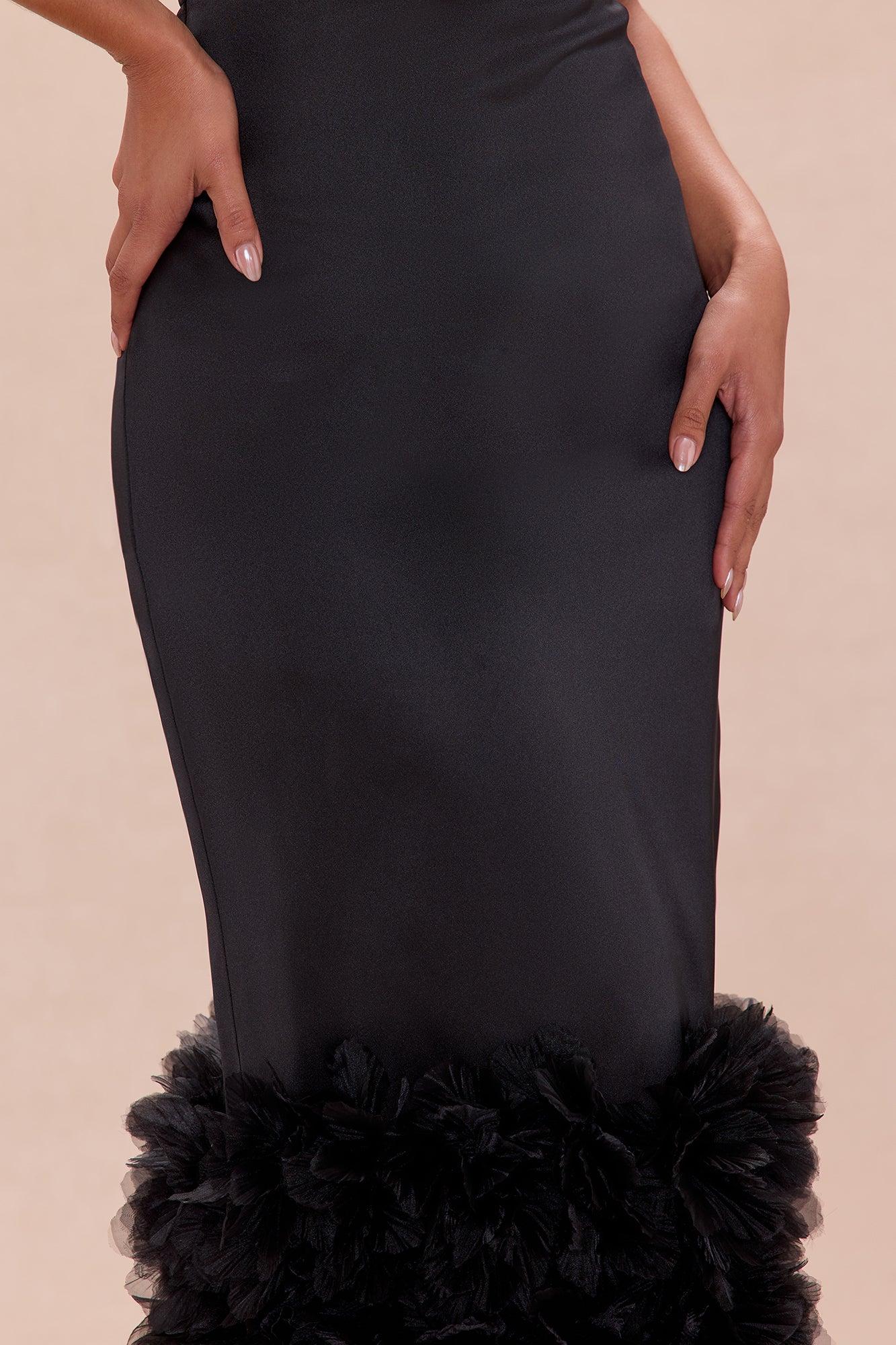 Available In Black. Satin Maxi Dress Sleeveless One Shoulder Neckline 3D Floral Applique Detail Hidden Back Zipper Closure Lined Non Stretch Shell: 96% Polyester 4% Spandex Lining: 97% Polyester 3% Spandex Imported California Proposition 65WARNING: Cancer and Reproductive Harm - www.P65Warnings.ca.gov.