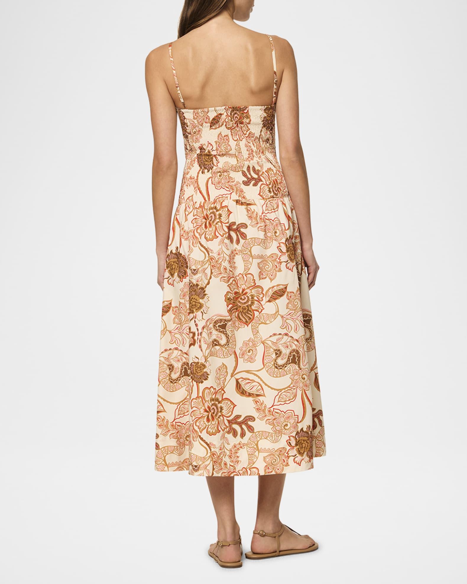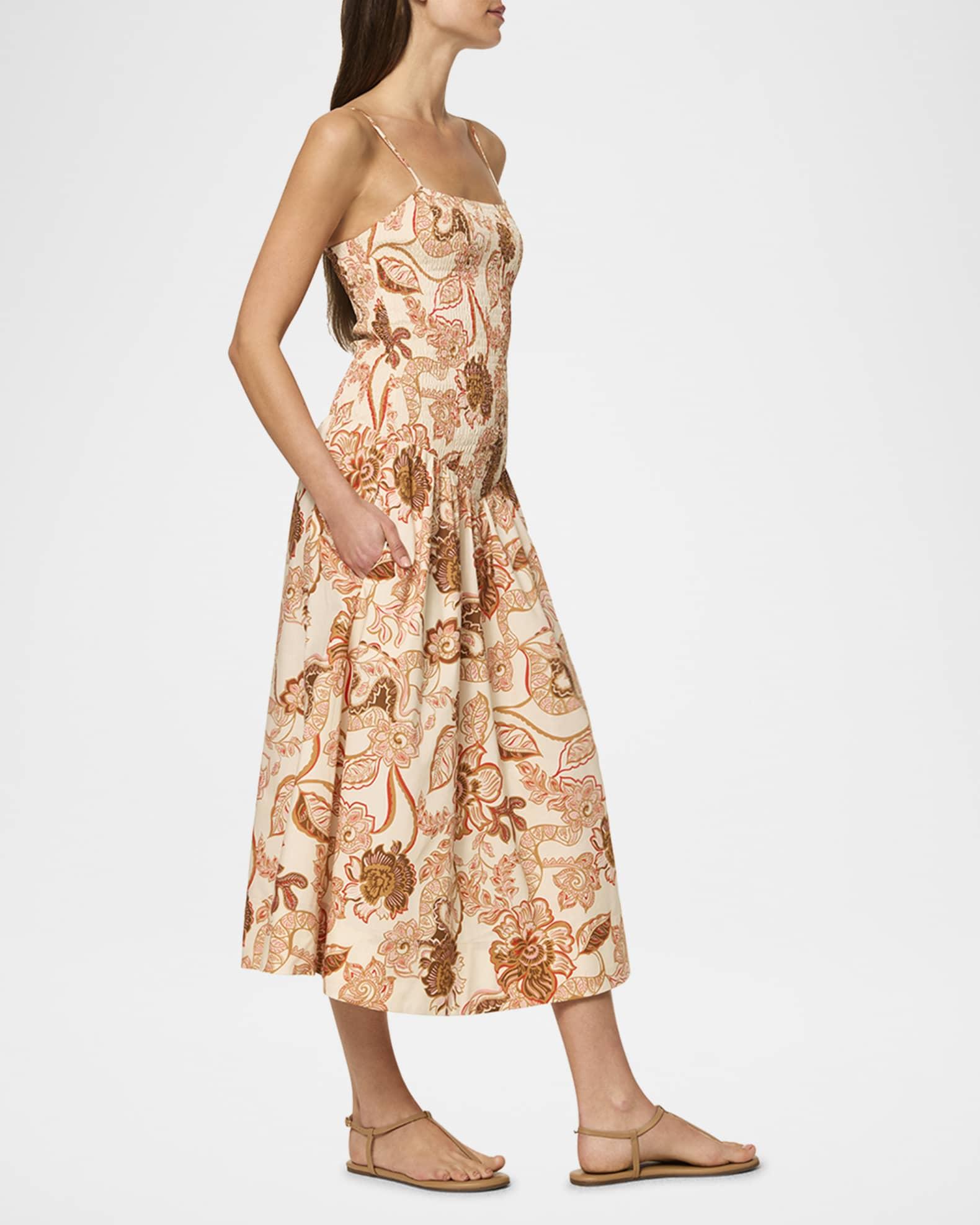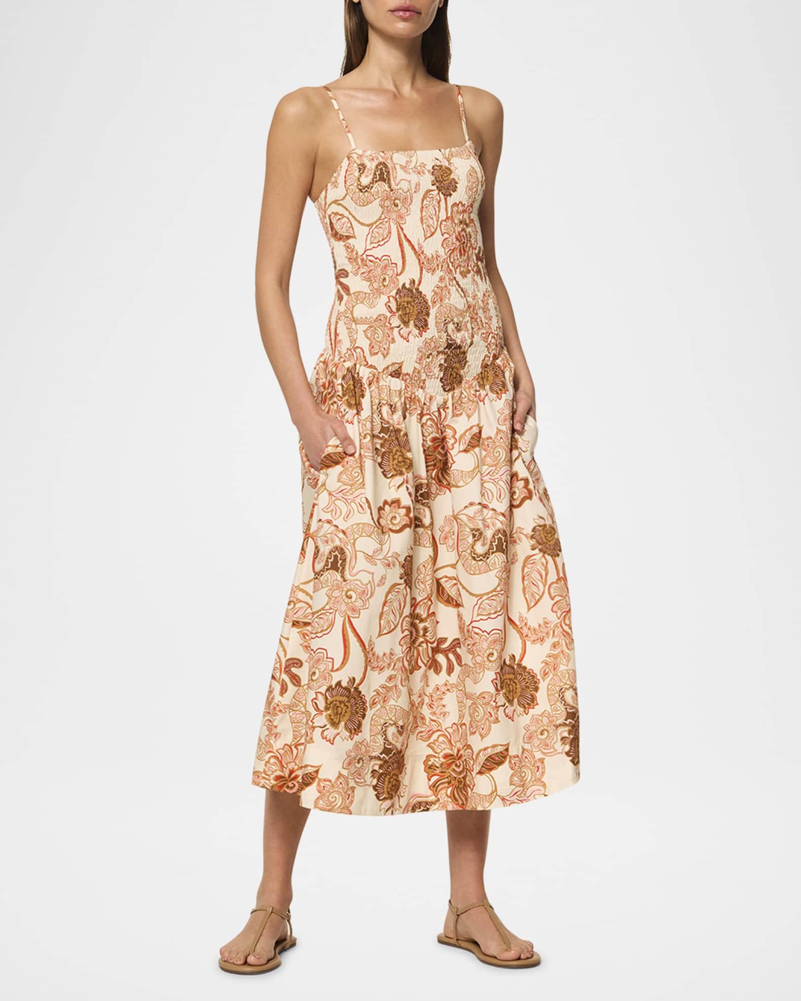 MISA Los Angeles "Roxie" floral batik poplin dress consists of smocked bodice and a drop-waist skirt Square neckline Sleeveless Side seam pockets Hem falls below the knee A-line silhouette Slipover style Polyester Dry clean Made in USA