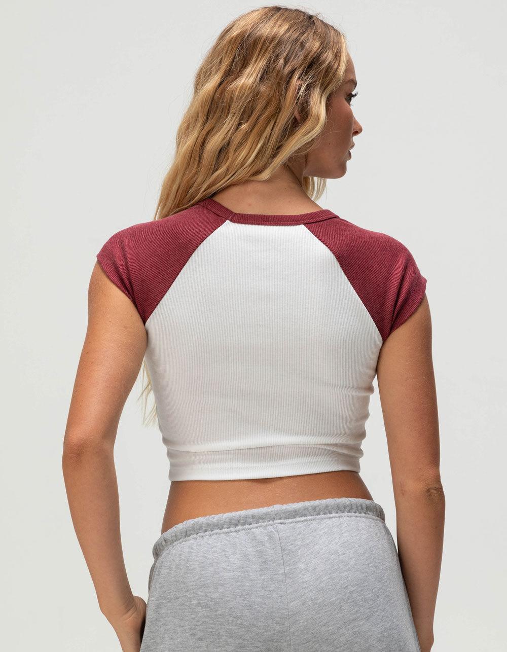 Roxy Flower Chain Raglan Baby Tee. The Roxy Flower Chain Raglan Baby Tee delivers a fun twist on a classic sporty silhouette. Made with soft, ribbed fabric, this cropped tee features raglan-style short sleeves for a relaxed yet flattering fit. The front is adorned with vibrant floral puff ink graphics, adding a textured, eye-catching detail that pops against the casual backdrop. Finished with a classic crew neckline, it’s the perfect piece to pair with your favorite denim, skirts, or shorts for a playful everyday look with a hint of athletic charm. 48% Cotton 48% Polyester 4% Spandex. Machine wash. Imported.