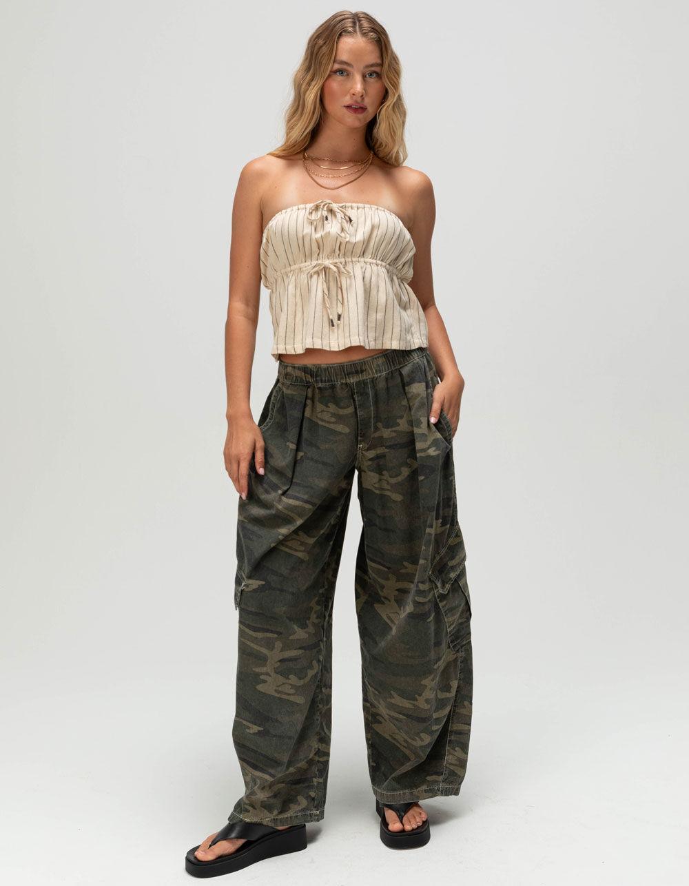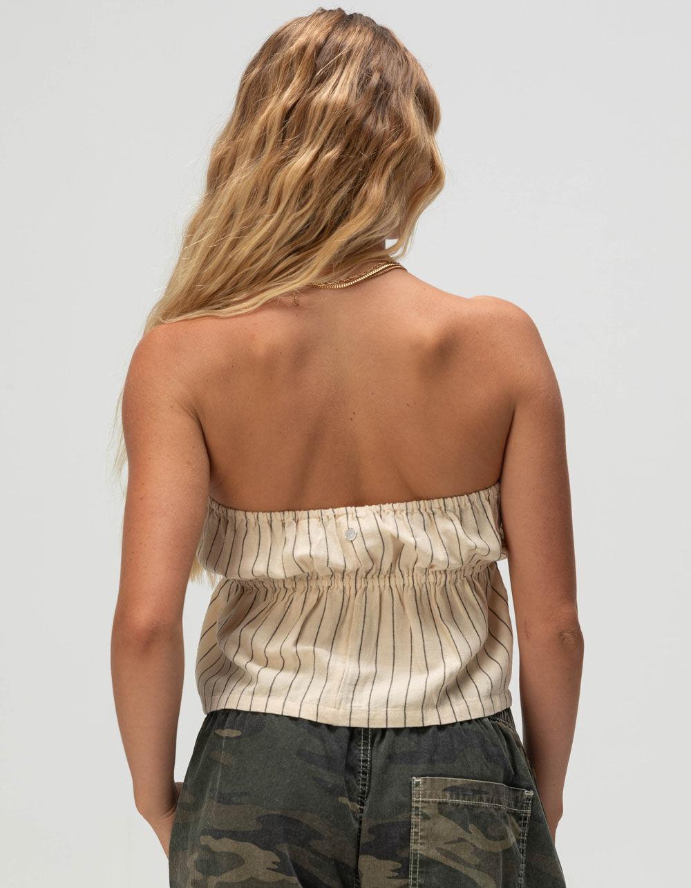 Roxy Iyla Tube Top. Allover stripe pattern. Elastic tie details. Sleeveless tube top. Cropped length. 55% Viscose 30% Cotton 15% Linen. Machine wash. Imported.