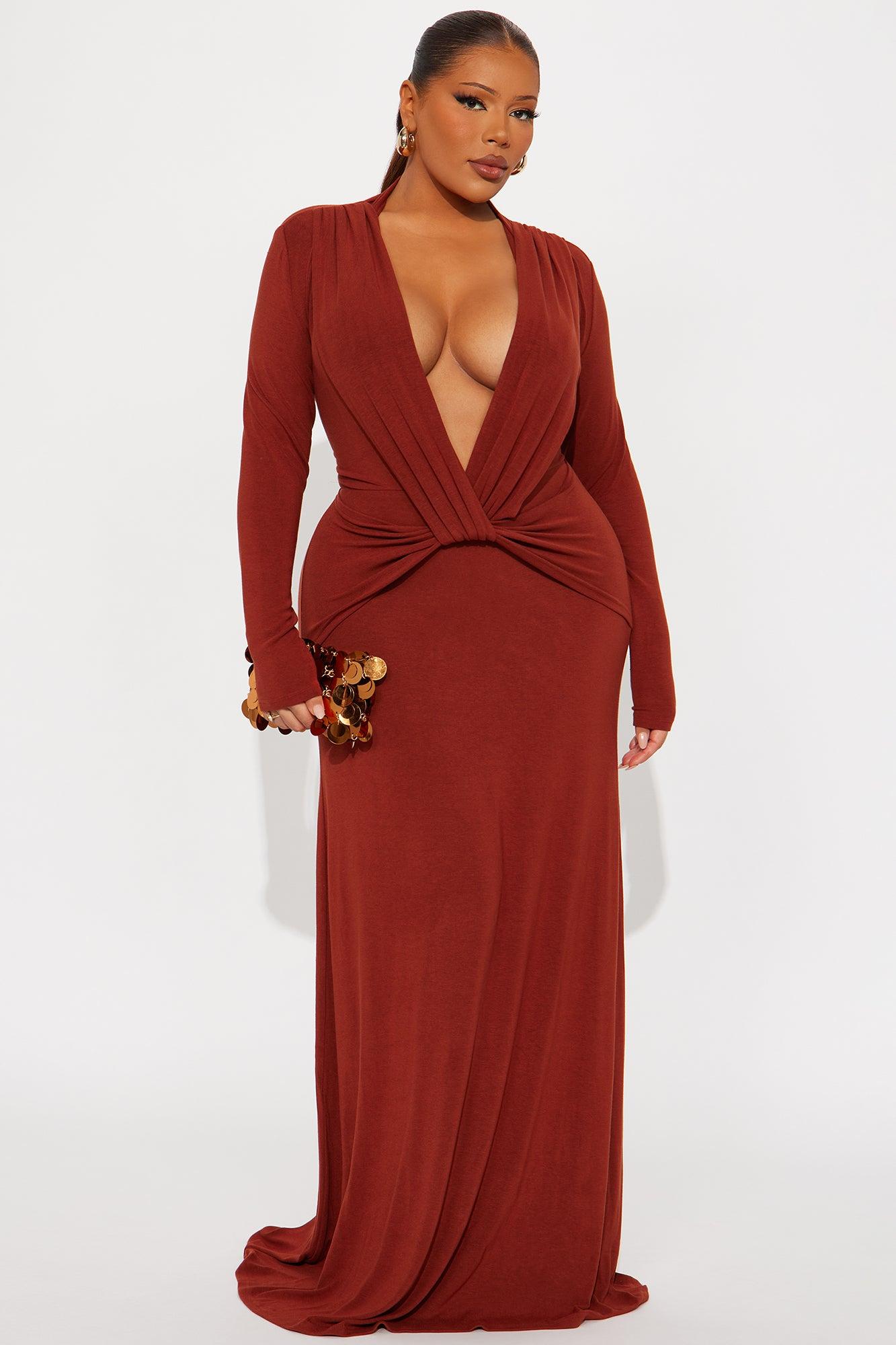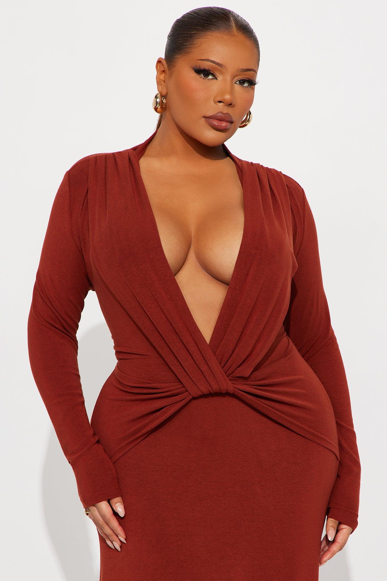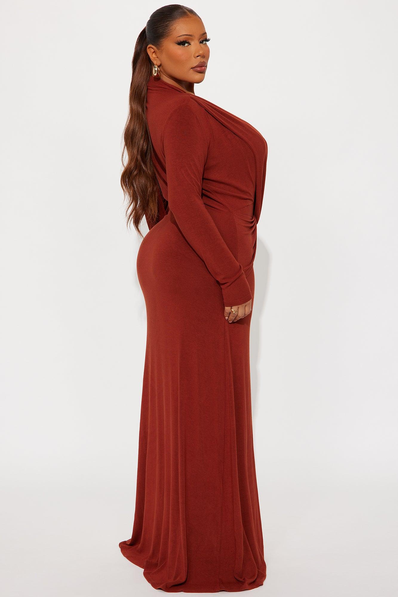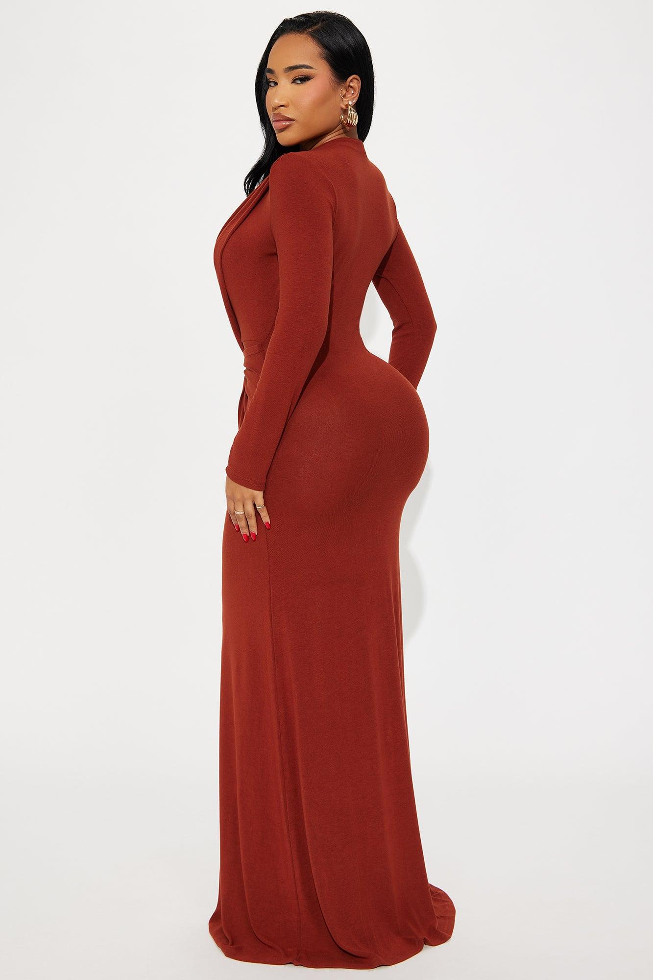 Available In Charcoal And Rust. Maxi Dress Long Sleeve Deep V-Neckline Knot/Twist Detail Stretch Self: 67% Rayon 27% Polyester 6% Spandex Imported