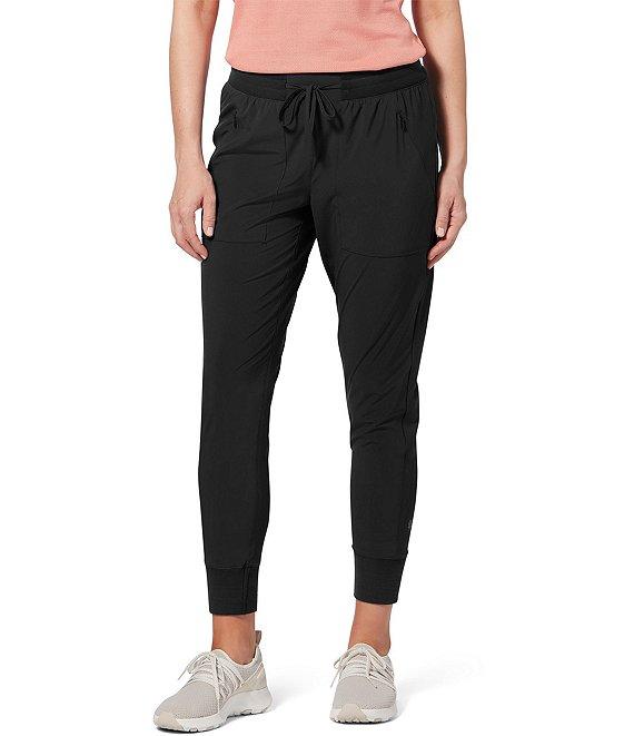 From Royal Robbins, these joggers features: Stretch weave woven fabrication Flat front silhouette Wide elastic waistband External drawstring at waist Two zip-secure front pocket One zip-secure back pocket UPF 40+ sun protection Relaxed fit Pull-on construction Approx. 27" inseam Recycled polyester/elastane Machine wash Imported.