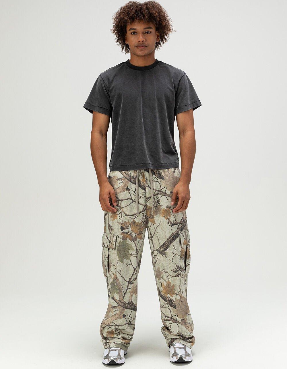 RSQ Baggy Cargo Sweatpants. Elastic waistband with drawstring. Side seam pockets. Cargo pockets with flap closures on each leg. Back right pocket. Woven label on back pocket. Baggy fit. Fleece lining. 60% Cotton 40% Polyester. Machine wash. Imported.