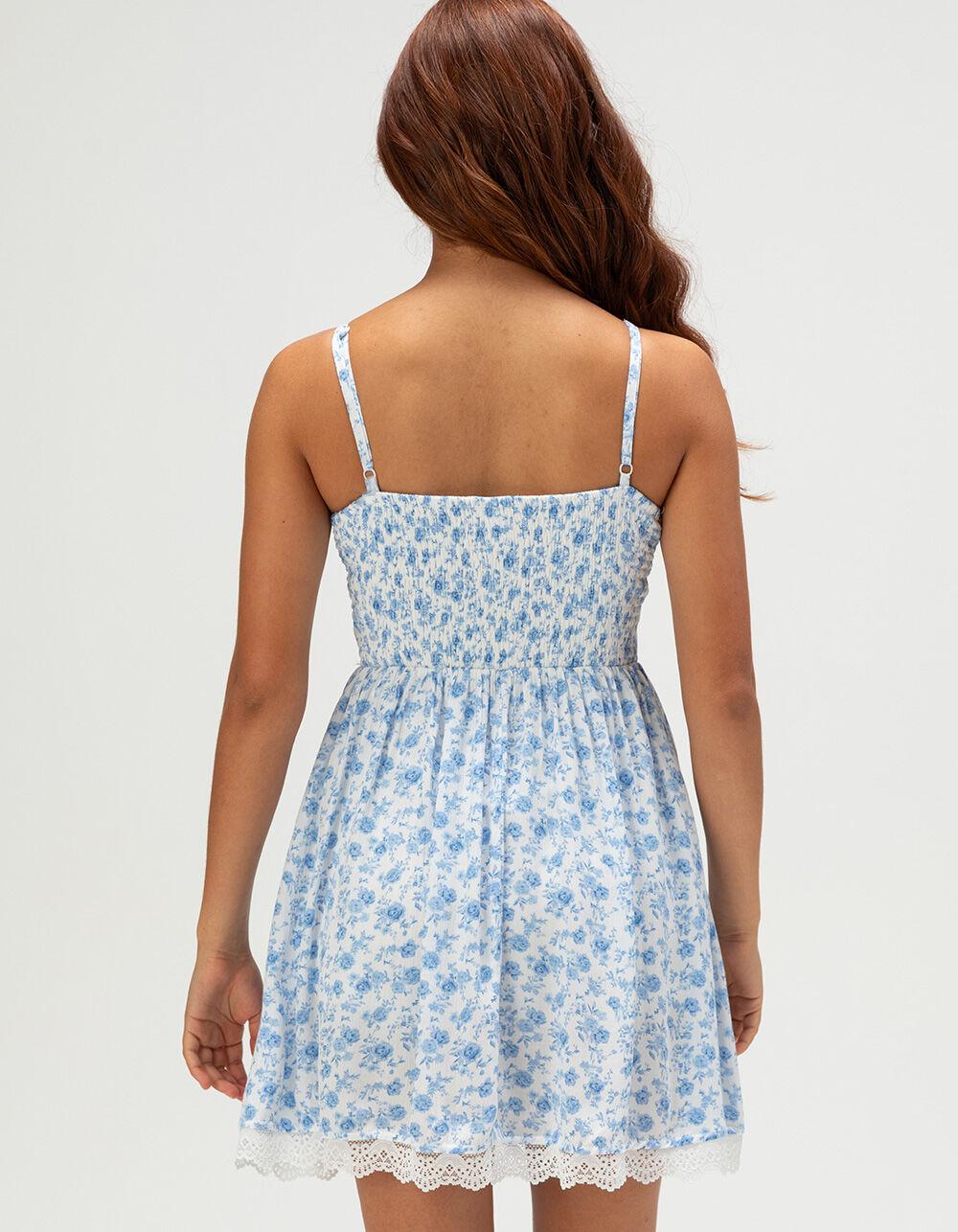 RSQ Ditsy Slip Dress. The RSQ Ditsy Slip Dress brings a soft, feminine feel to a timeless silhouette. Covered in an allover floral print, this sleeveless dress features delicate lace trim that adds a touch of vintage charm. Adjustable shoulder straps and a smocked back ensure a comfortable, flattering fit, while the fully lined design offers added coverage. With an approximate length of 32", it’s the perfect piece to wear solo on sunny days or layered under a cardigan when the weather shifts. 100% Rayon. Lining: 100% Polyester. Machine wash. Imported.