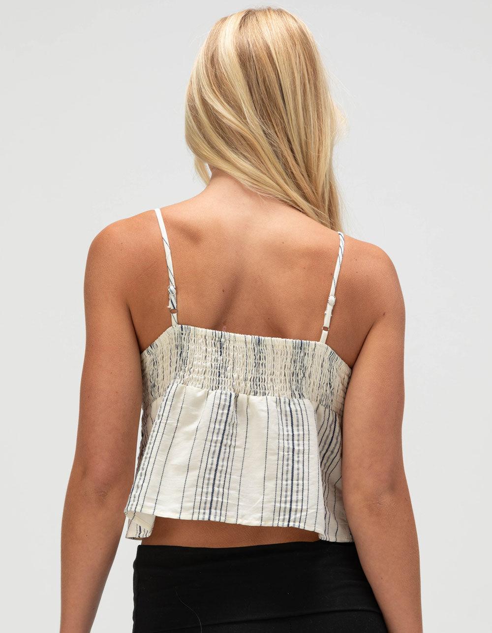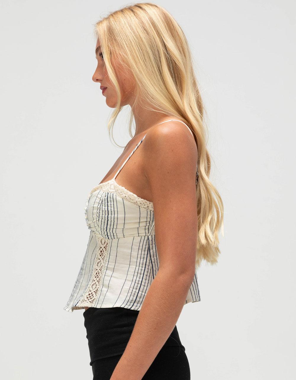 RSQ Stripe Crochet Babydoll Top. The RSQ Stripe Crochet Babydoll Top is a charming and feminine addition to any wardrobe. This sleeveless top showcases an allover stripe pattern accented by delicate crochet trim along the neckline and side panels, adding a touch of boho-inspired flair. Gathered details at the chest create a flattering, flowy silhouette, complemented by a 3-button closure at the front for subtle detailing. Adjustable shoulder straps ensure a customized fit, while the smocked back panel provides comfortable stretch. Finished with a lined bust for added coverage, this top pairs effortlessly with jeans, skirts, or shorts for a breezy, laid-back look. 100% Cotton. Hand wash. Imported.