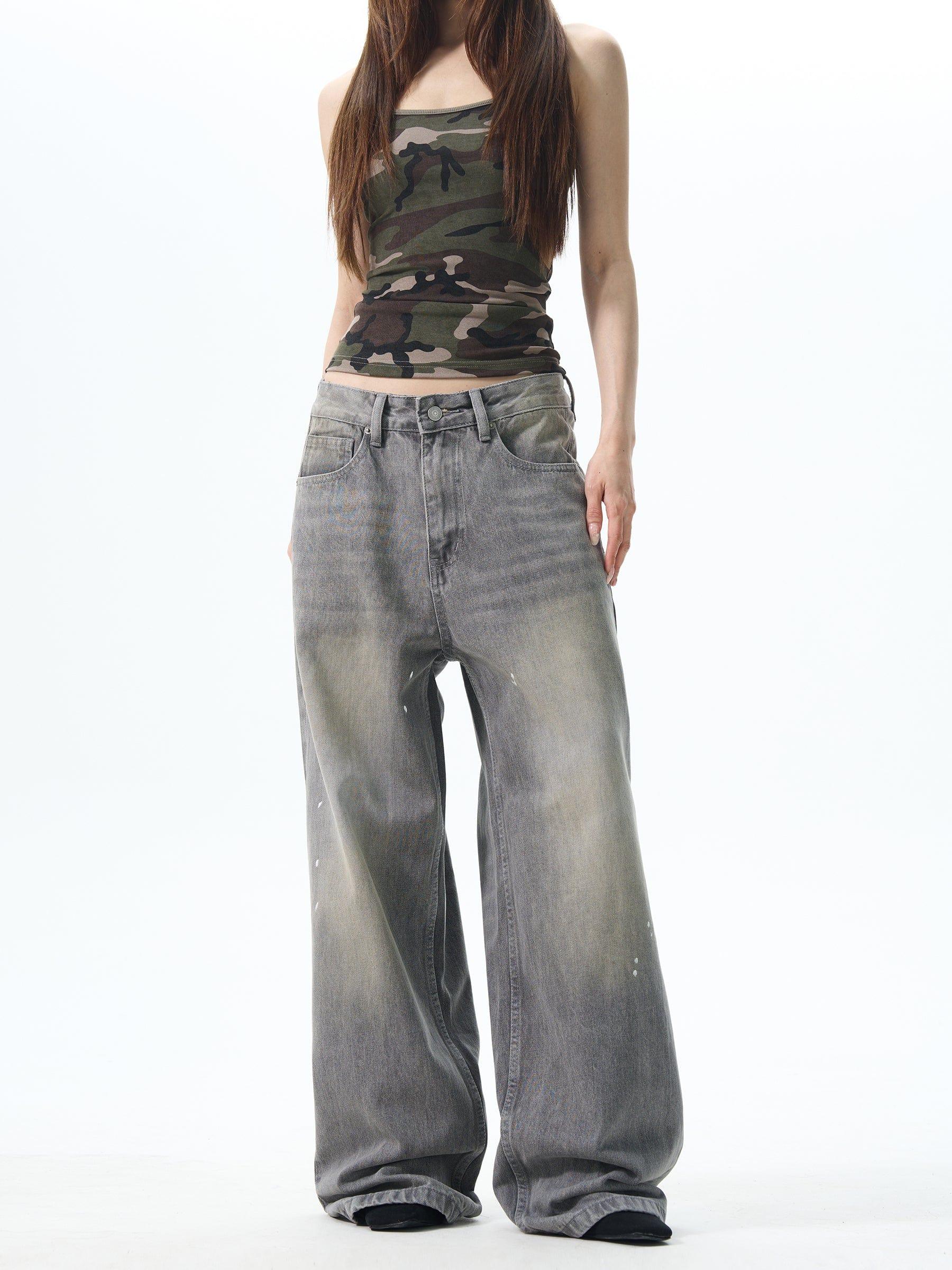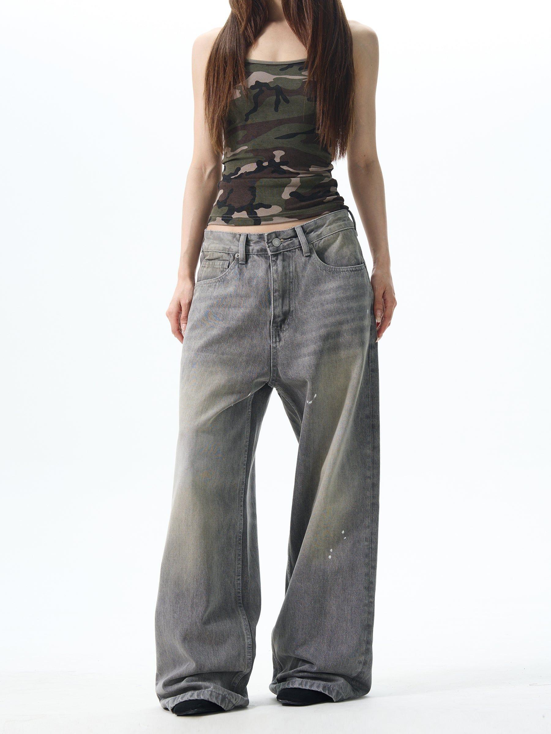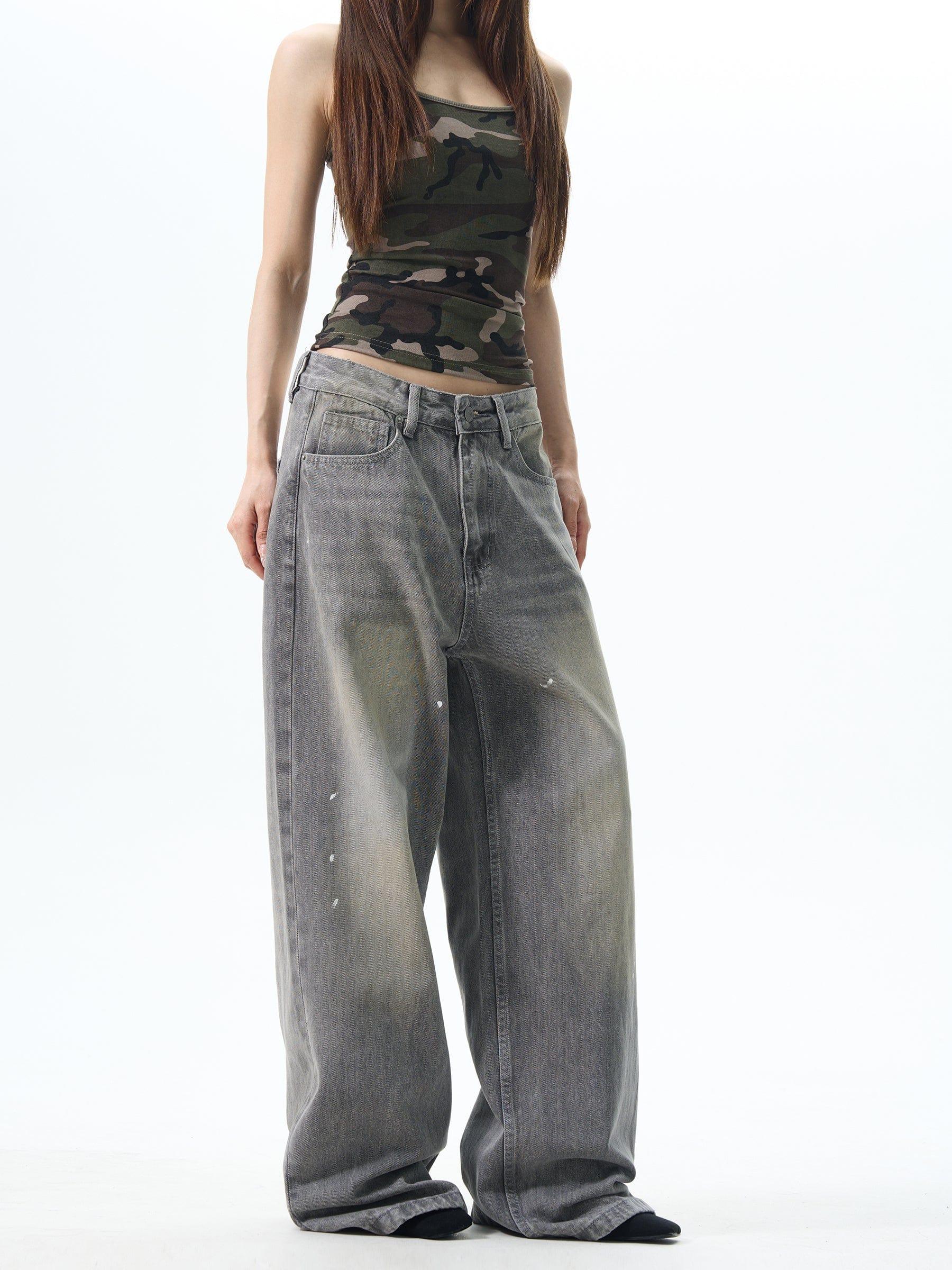 Model is 5ft 10''(178cm) tall, 145 lbs(66kg) weight and wearing a size L168cm 59kg wearing a size M - UNISEX- Wide straight fit- Washed- GRAY - Ink splash