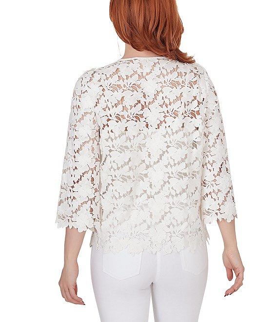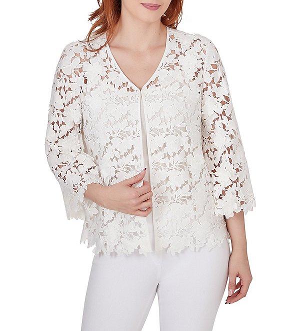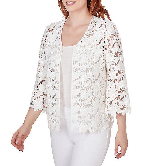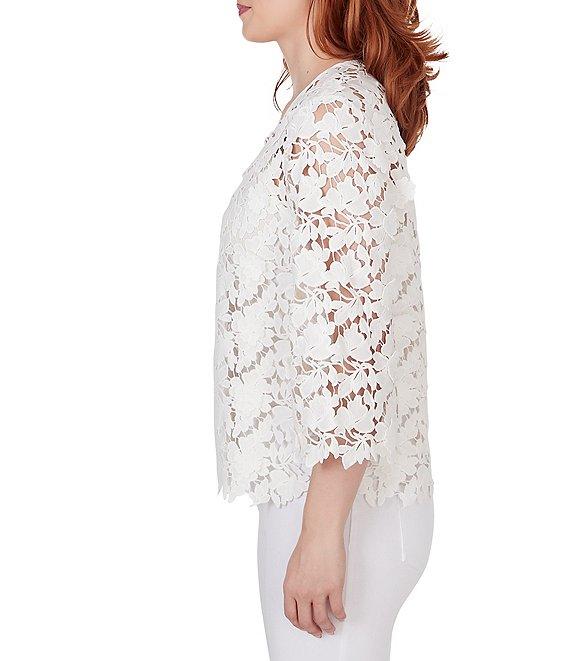 From Ruby Rd., this jacket features: V-neckline 3/4 bell sleeves Floral lace detailing throughout, creating a delicate and sophisticated look Hook and eye closure Approx. 24.5" length Polyester Hand wash cold/line dry Imported. This stunning top features intricate lace detailing throughout, creating a delicate and sophisticated look. The v-neckline and 3/4-length bell sleeves add a touch of vintage charm. The relaxed fit and curved hem provide comfort and style.