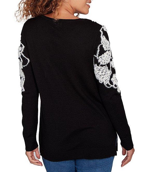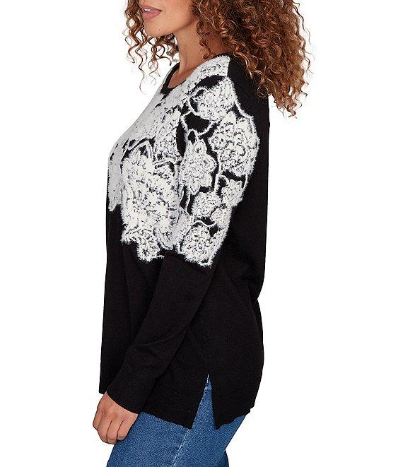 From Ruby Rd., this sweater features: Fuzzy eyelash jacquard knit fabrication Floral placement print Ribbed scoop neckline Long sleeves with ribbed cuffs Straight hemline with side vents Pullover construction Polyester/rayon/nylon Hand wash Imported.