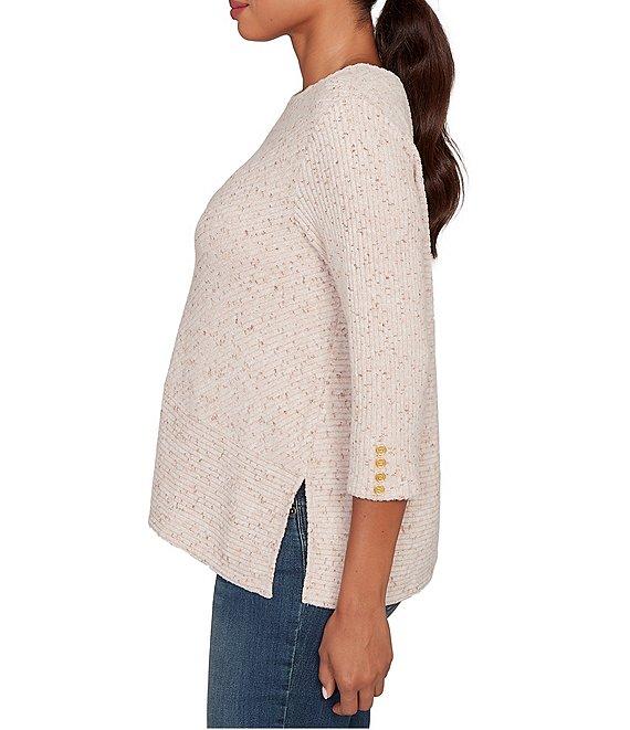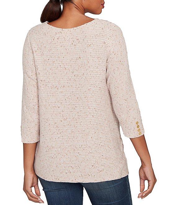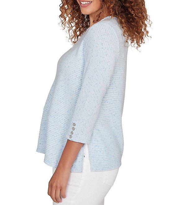From Ruby Rd., this top features: Heather speckled ribbed knit fabrication Crew neckline 3/4 sleeves with button details Straight hemline with side vents Pullover construction Polyester/spandex Machine wash Imported.