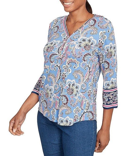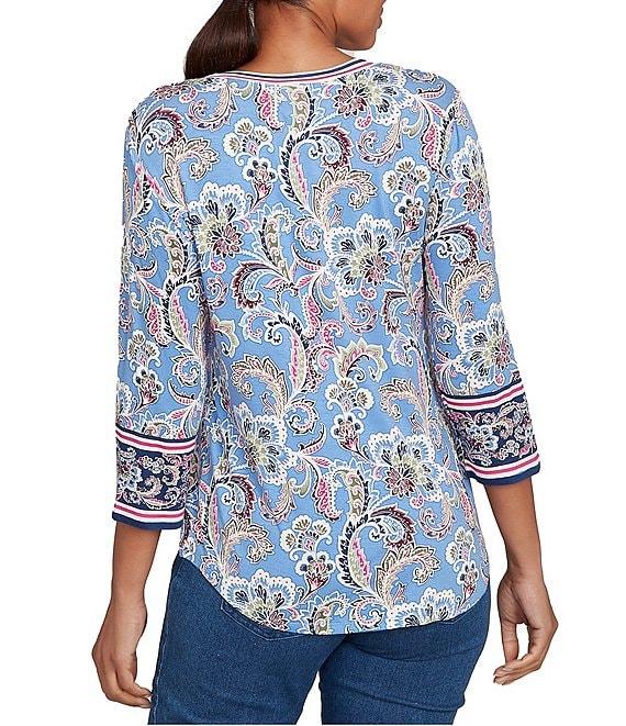 From Ruby Rd., this top features: Jersey knit fabrication V-neckline 3/4 sleeves Bold paisley design Striped ribbon trim at the neckline and cuffs Pullover construction Rayon/spandex Machine wash cold/lay flat to dry Imported. This printed jersey henley top features a bold paisley design, accented by striped ribbon trim at the neckline and cuffs. The half-button v-neckline adds a touch of casual flair, while the 3/4 sleeves give it an easy, all-day wearability. Perfect for adding a little extra pop to your everyday style.