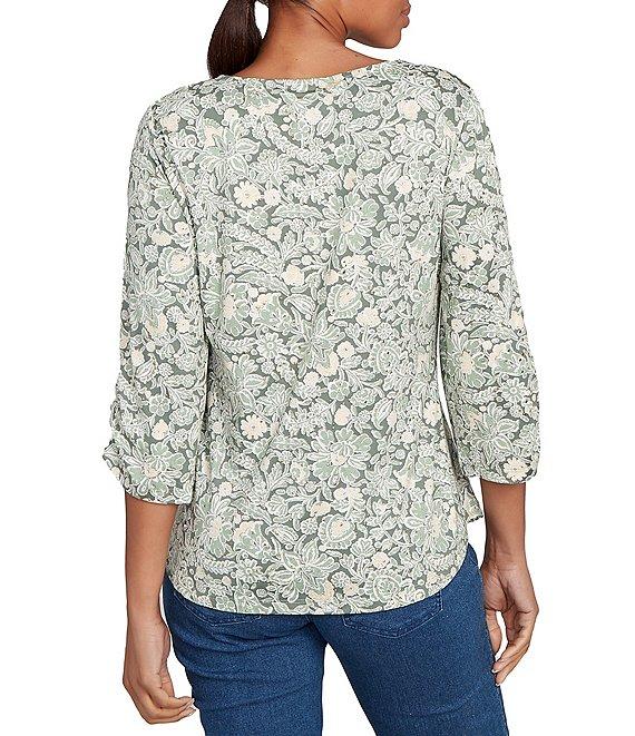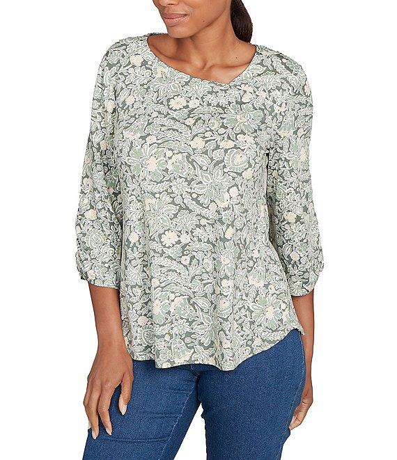 Ruby Rd. Knit Asymmetrical V-Neck 3/4 Sleeve Floral Dewdrop Embellished Top