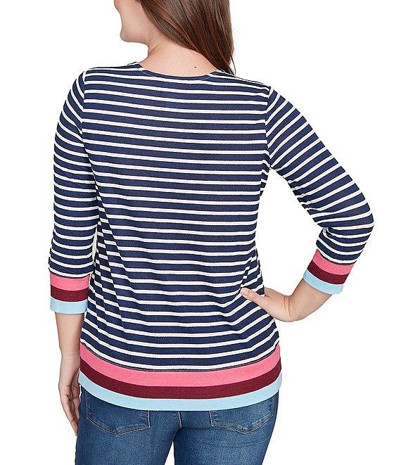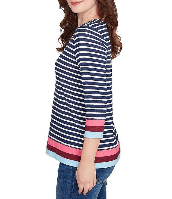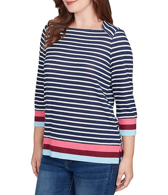From Ruby Rd., this top features: Knit fabrication Square neckline 3/4 sleeves Stripe pattern Bold contrast stripes at cuffs and hem Straight hem with side vents Pullover construction Polyester/spandex Machine wash Imported. Stripes that stand out. This soft hatchi knit top features a cozy foldover neckline and bold contrast stripes at the cuffs and hem. Finished with 3/4 sleeves and side slits for an easygoing fit that's anything but basic.