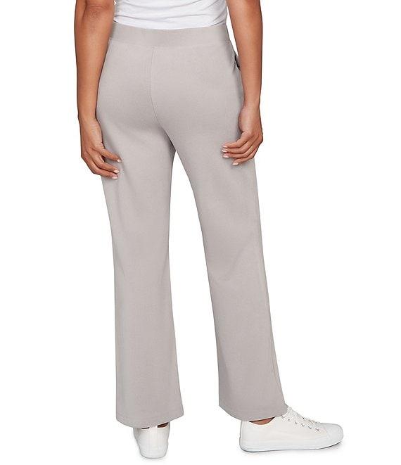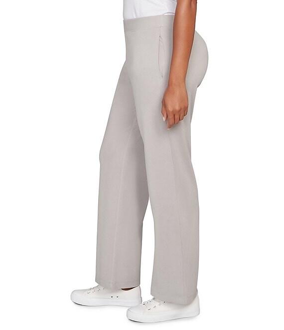 From Ruby Rd., these pants feature: Soft and stretchy luxe ribbed textured fabrication Straight leg silhouette Wide waistband Functional pockets Pull-on construction Approx. 30" inseam Polyester/spandex Machine wash/tumble dry Imported. Soft and stretchy luxe ribbed texture, side seam pockets and a wide elastic waistband make these pants feel like a dream. With a pull-on fit and full length, they're your stylish travel-ready essential.