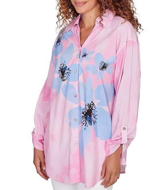 From Ruby Rd. Petite, this shirt features: Soft-hand poplin woven fabrication Point collar neckline 3/4 roll-tab sleeves Watercolor floral design Button-front closure Cotton/rayon Machine wash cold Imported. Made from soft-hand poplin, this button-front top features a watercolor floral design over woven tie-dye, a classic shirt collar, and 3/4 roll-tab sleeves. Light, fluid, and a little artsy in the best way.