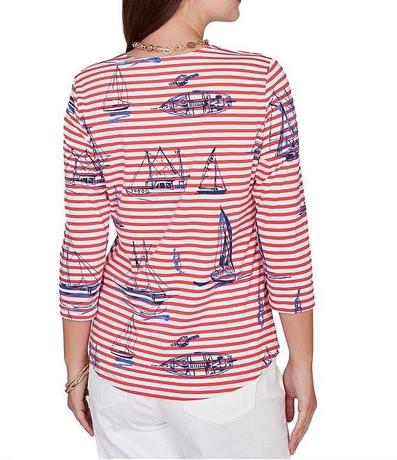 From Ruby Rd. Petite, this top features: Soft cotton jersey fabrication Square neckline 3/4 sleeves Allover sailboat, stripe print Embroidered accents Pullover construction Cotton/spandex Machine wash Imported. A charming mix of nautical flair and casual ease, this soft cotton jersey top features an allover sailboat print with embroidered accents. Designed with a crew neckline and 3/4 sleeves for easy layering.
