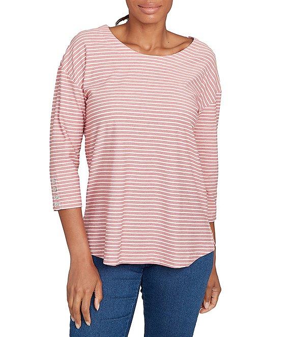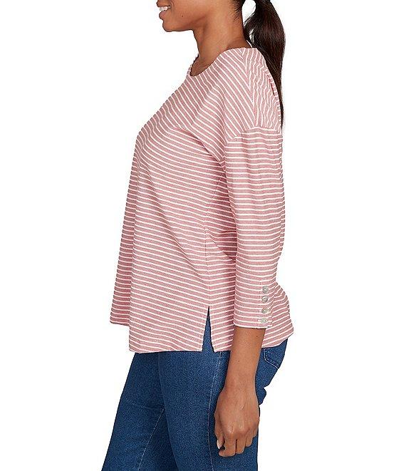 From Ruby Rd. Petite, this top features: Crew neckline 3/4 sleeves Stripe print Button detail at sleeves Straight hem with side vents Pullover construction Polyester/cotton/rayon Machine wash Imported.