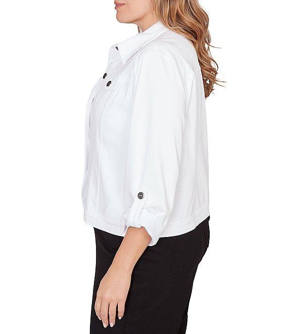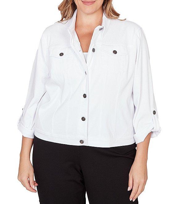 From Ruby Rd. Plus, this jacket features: Soft knitted twill fabrication Point collar neckline Long roll-tab sleeves Chest pockets Side seam pockets Button-front closure Approx. 23" length Cotton Machine wash/tumble dry Imported. This modern take on the classic jean jacket is crafted in soft knitted twill for all-day comfort and stretch. Styled with a button front, roll-tab sleeves, and convenient on-seam pockets, its the perfect lightweight layer for any season. The structured silhouette offers polish, while the knit fabric keeps it casual and easy to wear.